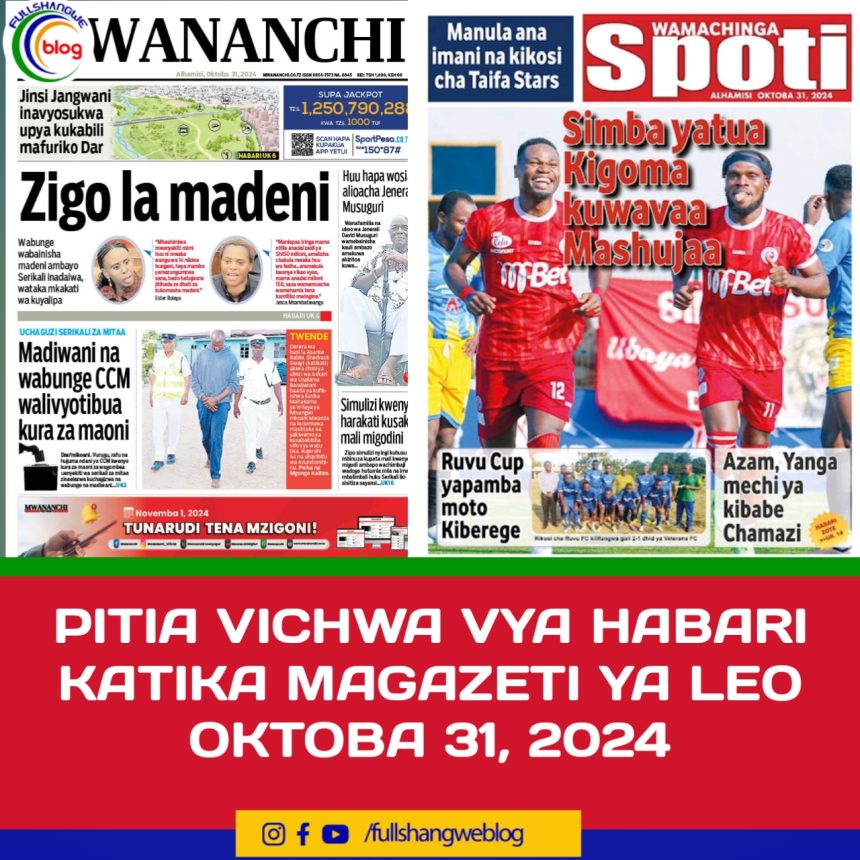 MagazetiPITIA VICHWA VYA HABARI KATIKA MAGAZETI YA LEO OKTOBA 31, 2024 Last updated: 2024/10/31 at 1:29 AM John Bukuku 1 year ago Share SHARE John Bukuku October 31, 2024 October 31, 2024 Share this Article Facebook Twitter Email Print Previous Article MATI SUPER BRANDS LTD YAIBUKA KINARA MAONYESHO YA TANZANITE MANYARA TRADE FAIR 2024 Next Article RAIS SAMIA ASHIRIKI MJADALA KUHUSU KILIMO AFRIKA NCHINI MAREKANI