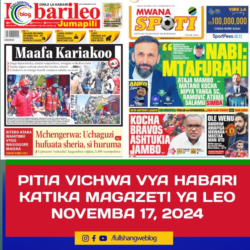 MagazetiPITIA VICHWA VYA HABARI KATIKA MAGAZETI YA LEO NOVEMBA 17, 2024 Last updated: 2024/11/17 at 1:40 AM John Bukuku 12 months ago Share SHARE John Bukuku November 17, 2024 November 17, 2024 Share this Article Facebook Twitter Email Print Previous Article MSD YAKABIDHI DAWA NA VIFAA VYA DHARURA AJALI YA JENGO KARIAKOO Next Article RAIS SAMIA AKIWASILI RIO DE JANEIRO BRAZIL