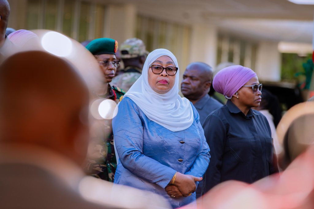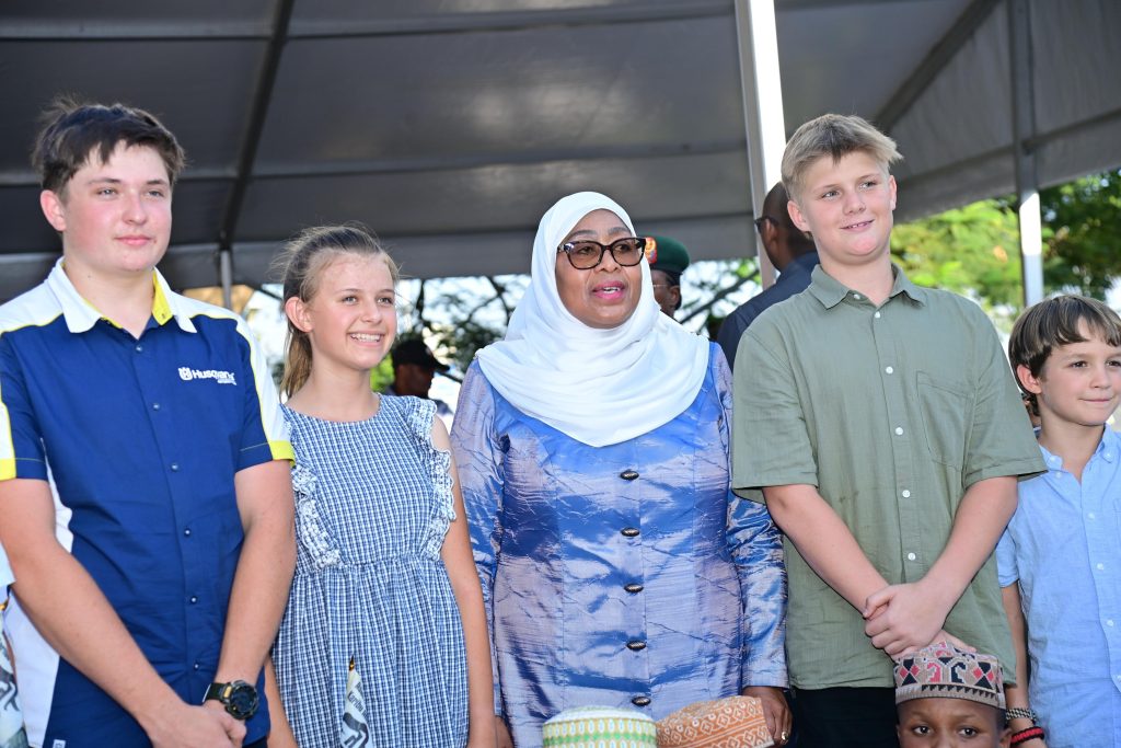 Rais wa Jamhuri ya Muungano wa Tanzania Mhe. Dkt. Samia Suluhu Hassan akiwa katika picha ya pamoja na watoto wakati wa mapokezi yake katika Uwanja wa Ndege wa Kimataifa wa Kilimanjaro (KIA) tarehe 27 Novemba, 2024.