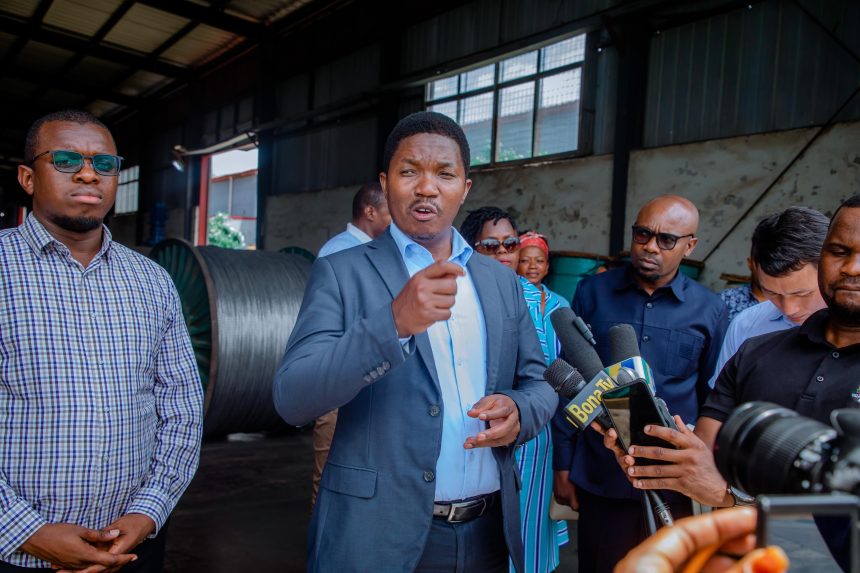 Waziri wa Viwanda na Biashara Mhe.Dkt.Selemani Jafo(Mb) akizungumza na waandishi wa habari mara baada ya kutembelea Kiwanda cha Everwell Cable kinachotengeneza Nyaya za umeme na Nguzo za zege kilichopo Wilaya ya Mkuranga Mkoani Pwani Disemba 03,2024.