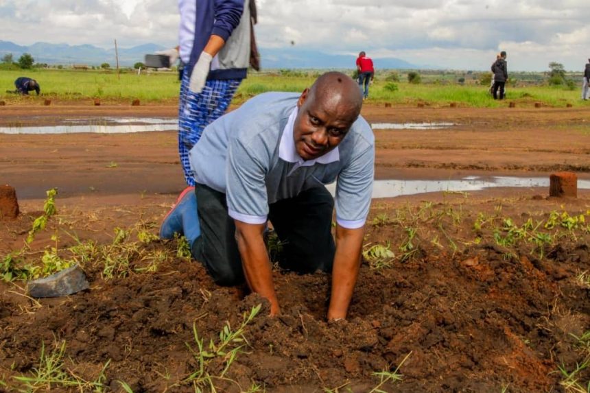 Mkurugenzi wa Halmashauri ya wilaya ya Sumbawanga Vijijini Kwangwala Misana wakati akipanda mti katika maadhimisho ya siku ya uhuru wa Tanzania Bara katika shule ya Sekondari ya wasichana Rukwa