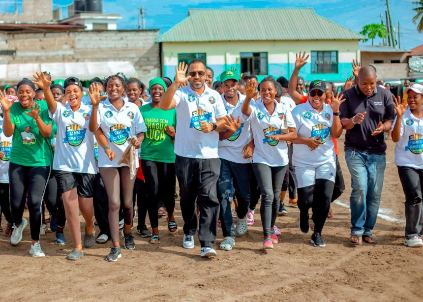 Diwani wa Chama Cha Mapinduzi Kata ya Msasani Luca Neghest (mwenye miwani) akishiriki katika maandamano wakati wa uzinduzi wa Samia Supa Cup Msasani aliyoyaandaa.