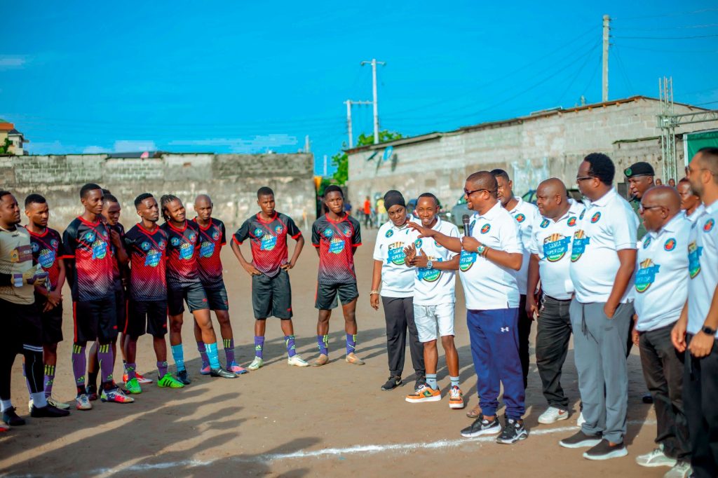 Mwenyekiti wa Chama Cha Mapinduzi wa Manispaa ya Kinondoni, Shaweji Abdallah Mkumbula akizungumza kabla ya mechi ya ufunguzi wa mashindano ya Samia Supa Cup Msasani kati ya timu ya Don Bosco na Juventus kwenye uwanja wa Msasani jijini. Mashindano hayo yameandaliwa na Diwani Luca Neghest.