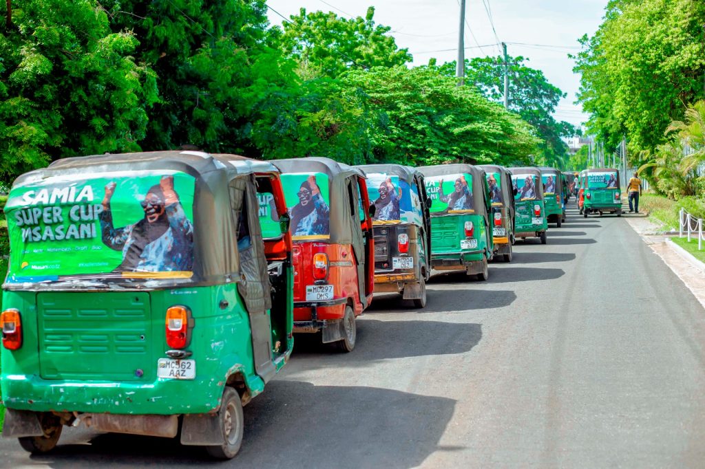 Msafara wa pikipiki aina za Bajaj ukipamba uzinduzi wa mashindano ya Samia Supa Cup Msasani yaliyoandaliwa Diwani Luca Neghest.