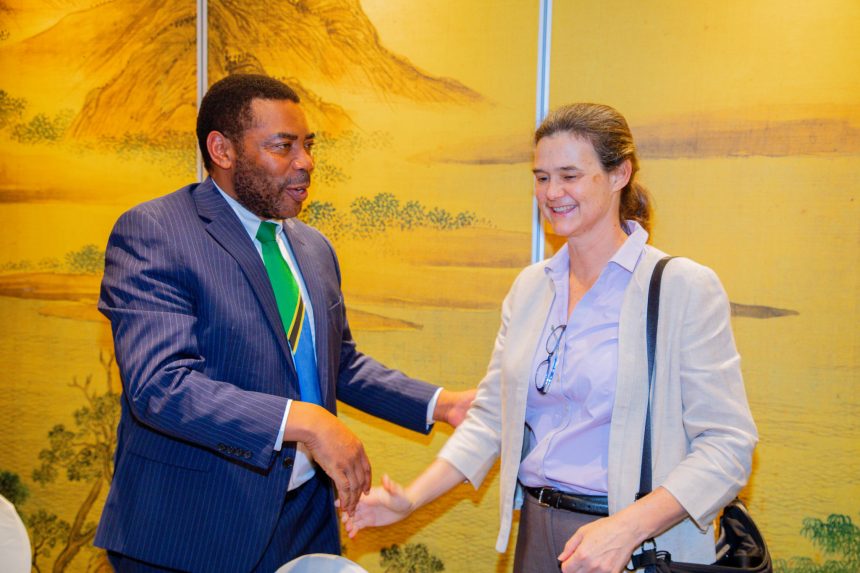Waziri wa Fedha, Mhe. Dkt. Mwigulu Lameck Nchemba, akilakiana na Mkurugenzi wa benki ya Dunia, anayesimamia Miundombinu, Bi. Wendy Hughes, alipofanya ziara ya kikazi nchini, ambapo Mkurugenzi huyo alikutana na kufanya mazungumzo na Mawaziri watatu wa Kisekta, akiwemo Waziri wa Uchukuzi, Prof. Makame Mbarawa na Waziri wa Ujenzi Mhe. Dkt. Abdallah Ulega, ambapo walijadili kuhusu Mradi wa Mabasi yaendayo Haraka-BRT, Ujenzi wa Mradi wa Treni ya Mwendo Kasi (SGR), na namna ya kuiwezesha sekta binafsi kwa kushirikiana na Sekta ya Umma kushiriki katika utekelezaji wa miradi ya maendeleo.(Picha na Kitengo cha Mawasiliano Serikalini-Wizara ya Fedha- Dar es Salaam)