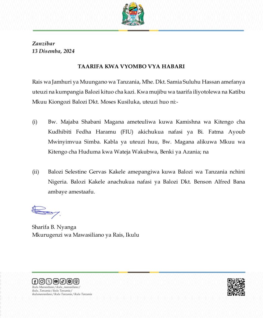 MchanganyikoRAIS SAMIA AFANYA UTEUZI NA KUMPANGIA KITUO CHA KAZI BALOZI Last updated: 2024/12/14 at 2:47 AM John Bukuku 11 months ago Share SHARE John Bukuku December 14, 2024 December 13, 2024 Share this Article Facebook Twitter Email Print Previous Article UJENZI WA KIVUKO CHA TRIPPI KUPUNGUZA UTORO KWA ASILIMIA 98 – MBULU Next Article SERIKALI YA TANZANIA YATEKELEZA MIKAKATI YA KUBORESHA HUDUMA ZA DHARURA