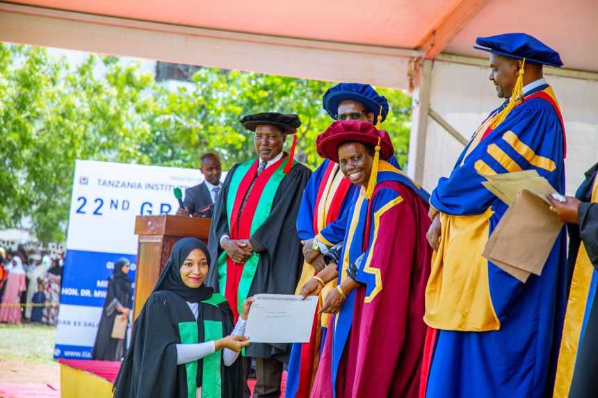 Naibu Katibu Mkuu Wizara ya Fedha, Bi. Jenifa Christian Omolo, akimkabidhi cheti cha pongezi kwa kufanya vizuri katika masomo yake ya Rasilimali Watu, Bi. Naf-hat fahmi Hamed, wakati wa Mahafali ya 22 ya Taasisi ya Uhasibu Tanzania (TIA) katika Kampasi ya Dar es Salaam Viwanja vya Kurasini ambayo ni Makao Makuu ya Taasisi hiyo.