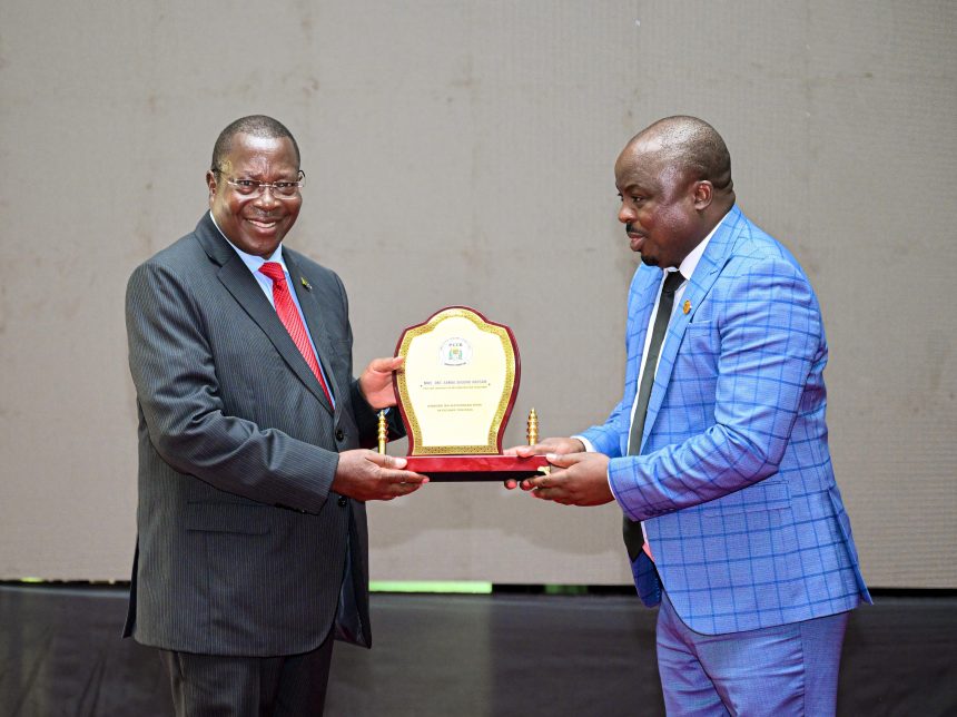Makamu wa Rais wa Jamhuri ya Muungano wa Tanzania Mhe. Dkt. Philip Mpango akikabidhiwa zawadi ya tuzo ya mapambano dhidi ya rushwa iliyotolewa kwa Rais wa Jamhuri ya Muungano wa Tanzania Mhe. Dkt. Samia Suluhu Hassan, mara baada ya ufunguzi wa Mkutano Mkuu wa Mwaka wa Viongozi wa Taasisi ya Kuzuia na Kupambana na Rushwa (TAKUKURU) unaofanyika katika Kituo cha Mikutano cha Kimataifa cha Arusha (AICC) mkoani Arusha leo tarehe 16 Desemba 2024. anayekabidhi tuzo hiyo ni Naibu Waziri Ofisi ya Rais, Menejimenti ya Utumishi wa Umma na Utawala Bora Mhe. Deus Sangu.