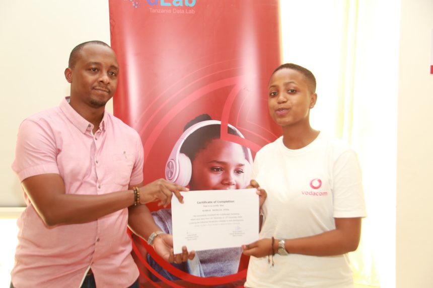 Meneja wa Kampuni ya Vodacom Tanzania Kanda ya Kati Joseph Sayi (kushoto) akimkabdhi cheti mwanafunzi Winnie Futa wakati wa kufunga mafunzo ya kuwajengea uwezo wanafunzi wa kike katika masomo ya Teknolojia ya Habari na Mawasiliano (TEHAMA) yaliyofadhiliwa na Vodacom.