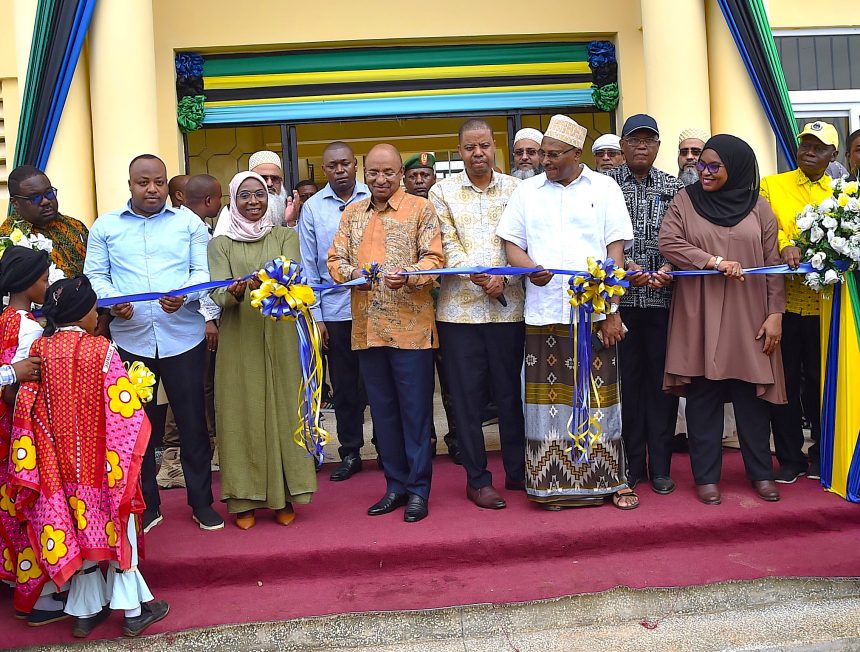 RAIS wa Zanzibar na Mwenyekiti wa Baraza la Mapinduzi Mhe.Dk.Hussein Ali Mwinyi akikata utepe kuifungua Skuli ya Sekondari Tumbatu Mkoa wa Kaskazini Unguja, ufunguzi huo uliyofanyika leo 4-1-2025, ikiwa ni Shamrashamra za Maadhimisho ya Miaka 61 ya Mapinduzi Matukufu ya Zanzibar na (kushoto kwa Rais) Mkuu wa Mkoa wa Kaskazini Unguja Mhe. Mattar Zahor Masoud, Mwakilishi wa Jimbo la Tumbatu Mhe.Haji Omar Kheri na Katibu wa Baraza la Mapinduzi na Katibu Mkuu Kiongozi Mhandisi Zena Ahmed Said na (kulia kwa Rais) Waziri wa Elimu na Mafunzo ya Amali Zanzibar Mhe. Lela Muhammed Mussa na Naibu Waziri wa Elimu na Mafunzo ya Amali Zanzibar.Mhe. Ali Abdulgulam Hussein.(Picha na Ikulu)