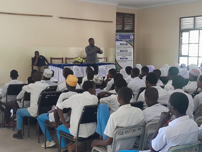 WANAFUNZI wa Chuo Cha Mafunzo ya Amali Vitongoji Wilaya ya Chake, Mkoa wa Kusini Pemba wakiwasikiliza Maofisa kutoka Tume ya Haki za Binaadamu na Utawala Bora (THBUB) juu ya uelewa mpana wa dhana ya Haki za binaadamu na misingi ya Utawala Bora
