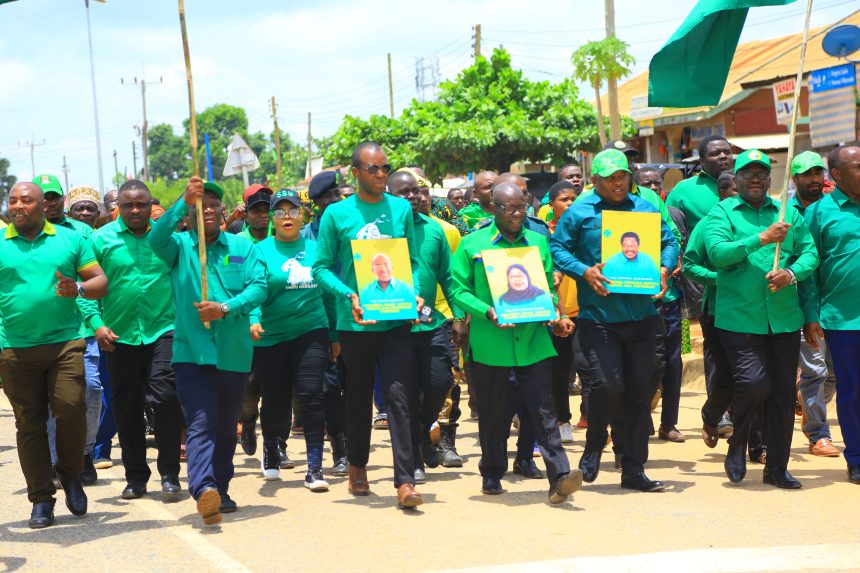 Mwenyekiti wa Chama cha Mapinduzi Mkoa wa Ruvuma Oddo Mwisho katikati,akiongoza matembezi ya Wanachama wa Chama hicho wa Wilaya ya Tunduru Namtumbo yaliyofanyika kwa lengo la kuunga mkono azimio la kumpitisha Rais Dkt Samia Suluhu Hassan kuwa Mgombea Urais wa Tanzania na Dkt Hussen Ali Mwinyi kuwa Mgombea Urais wa Zanzibar,kulia kwake Mjumbe wa Halmashauri kuu Hemed Challe.