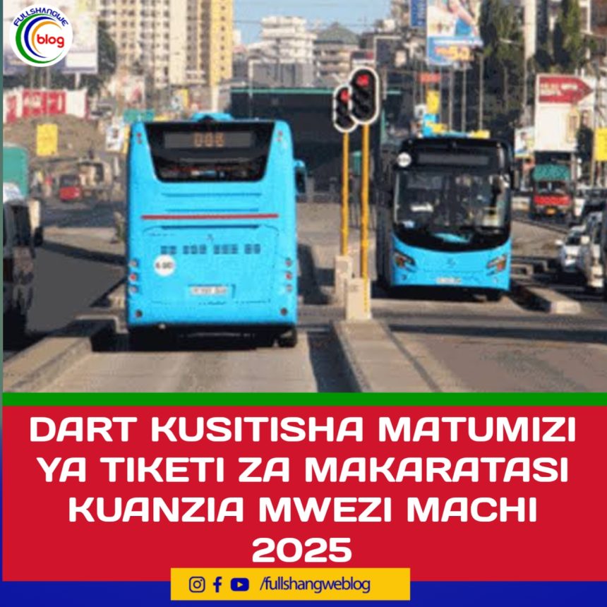 Wakala wa Mabasi Yaendayo Haraka DART umesema kuanzia mwezi Machi mwaka huu wa 2025 utasitisha rasmi matumizi ya tiketi za karatasi katika usafiri wa Mabasi Yaendayo Haraka na badala yake watumiaji wote wa Mabasi watatakiwa kutumia kadi janja ambazo zinaendelea kuuzwa katika vituo vikuu vya mradi huo.
