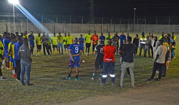 Wachezaji wa timu ya Barrick North Mara na Chuo kikuu cha Mwalimu Nyerere wakipata mawaidha kabla ya kuanza mechi ya soka ya kirafiki iliyofanyika katika viwanja vya North Mara ambapo North Mara iliibuka na ushindi wa bao 1-0