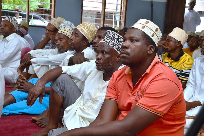 RAIS wa Zanzibar na Mwenyekiti wa Baraza la Mapinduzi Alhajj Dk.Hussein Ali Mwinyi akijumuika na Waumini wa Dini ya Kiislam katika kuitikia dua ikisomwa na Naibu Mufti Mkuu wa Zanzibar Sheikh Mahmoud Mussa Wadi (kushoto kwa Rais) na (kulia kwa Rais) Waziri wa Nchi Afisi ya Rais,Katiba,Sheria,Utumishi na Utawala Bora Zanzibar Mhe.Haroun Ali Suleiman na Mkuu wa Mkoa wa Kusini Unguja Mhe. Ayoub Mohamed Mahmoud.(Picha na Ikulu)