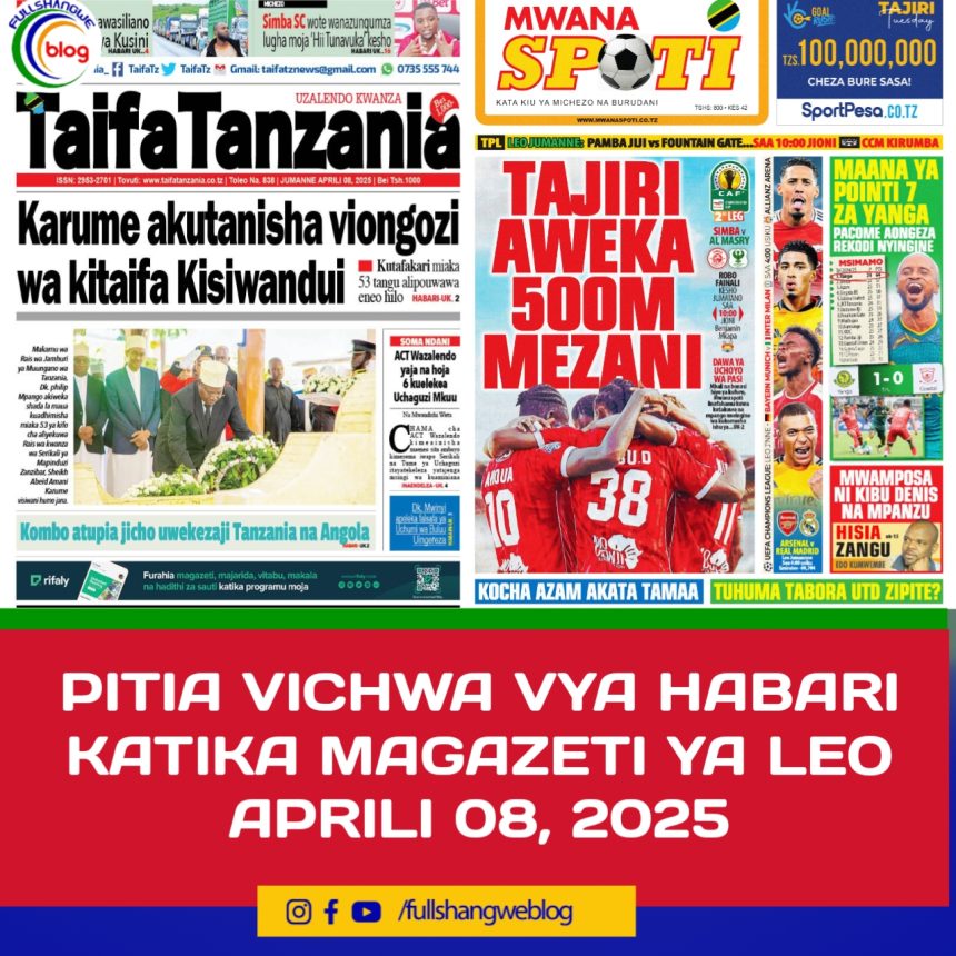 MchanganyikoPITIA VICHWA VYA HABARI KATIKA MAGAZETI YA LEO APRILI 08, 2025 Last updated: 2025/04/08 at 3:19 AM John Bukuku 1 year ago Share SHARE John Bukuku April 8, 2025 April 7, 2025 Share this Article Facebook Twitter Email Print Previous Article WAJUMBE KONGAMANO LA UONGOZI LA AFRIKA WATOA WITO KWA MTAZAMO MPYA KATIKA UTEKELEZAJI WA SDGs Next Article MCHENGERWA: KAZI YA KULETA MAENDELEO RUFIJI NI IBADA