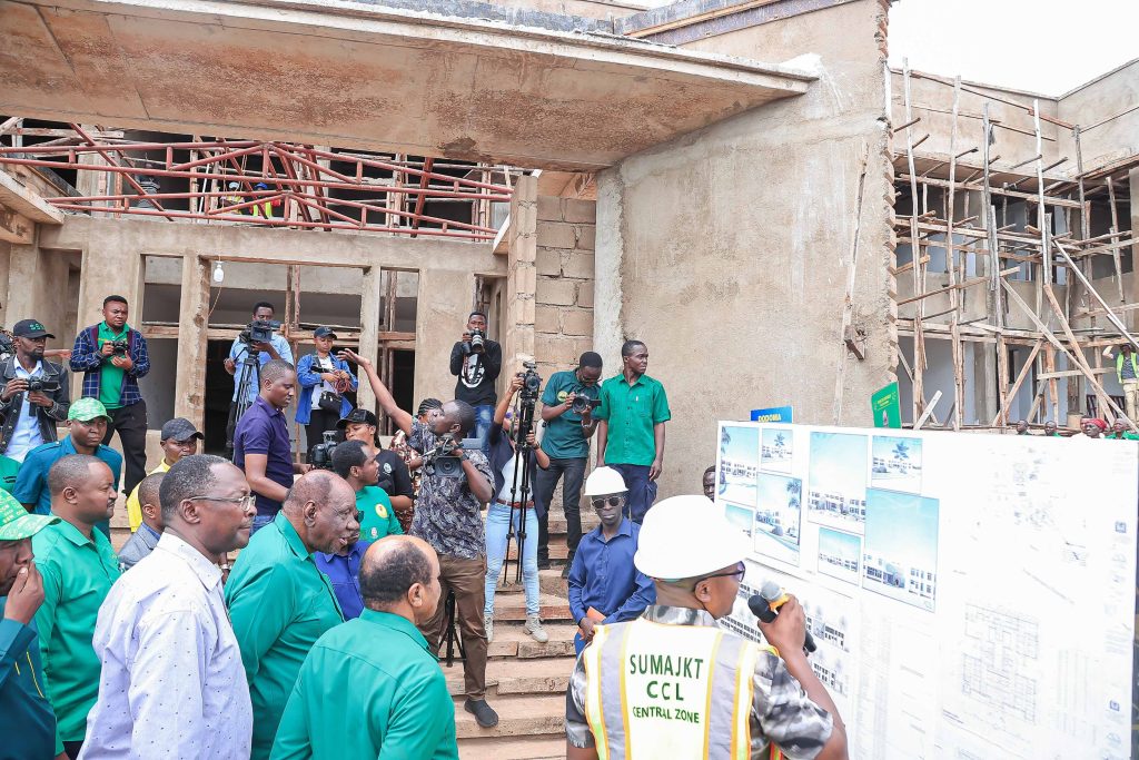 MAKAMU Mwenyekiti wa Chama Cha Mapinduzi (CCM) Tanzania Bara Stephen Wasira, akikagua Maendeleo ya Ujenzi wa jengo la Halmashauri ya wilaya ya Kongwa akiwa katika ziara ya kukagua uhai wa Chama, utekelezaji wa Ilani ya Uchaguzi Mkoa wa Dodoma.