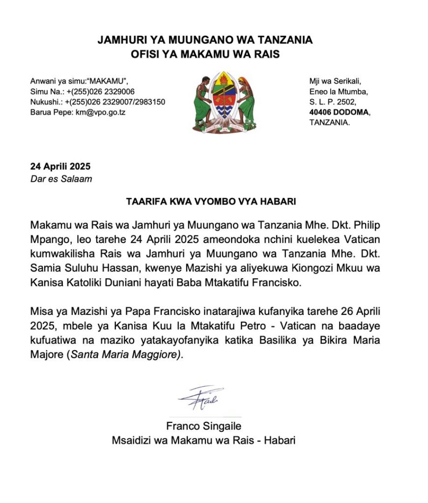 SiasaMAKAMU WA RAIS KUMWAKILISHA RAIS SAMIA KATIKA MAZISHI YA PAPA VATICAN Last updated: 2025/04/24 at 6:34 PM John Bukuku 7 months ago Share SHARE John Bukuku April 24, 2025 April 24, 2025 Share this Article Facebook Twitter Email Print Previous Article ONGEZEKO LA MAPATO NAMANGA LAMKOSHA DKT. BITEKO Next Article WAKURUGENZI WA HALMASHAURI WAELEKEZWA KUWASILISHA MAJINA YA WATUMISHI WANAODAI MALIMBIKIZO