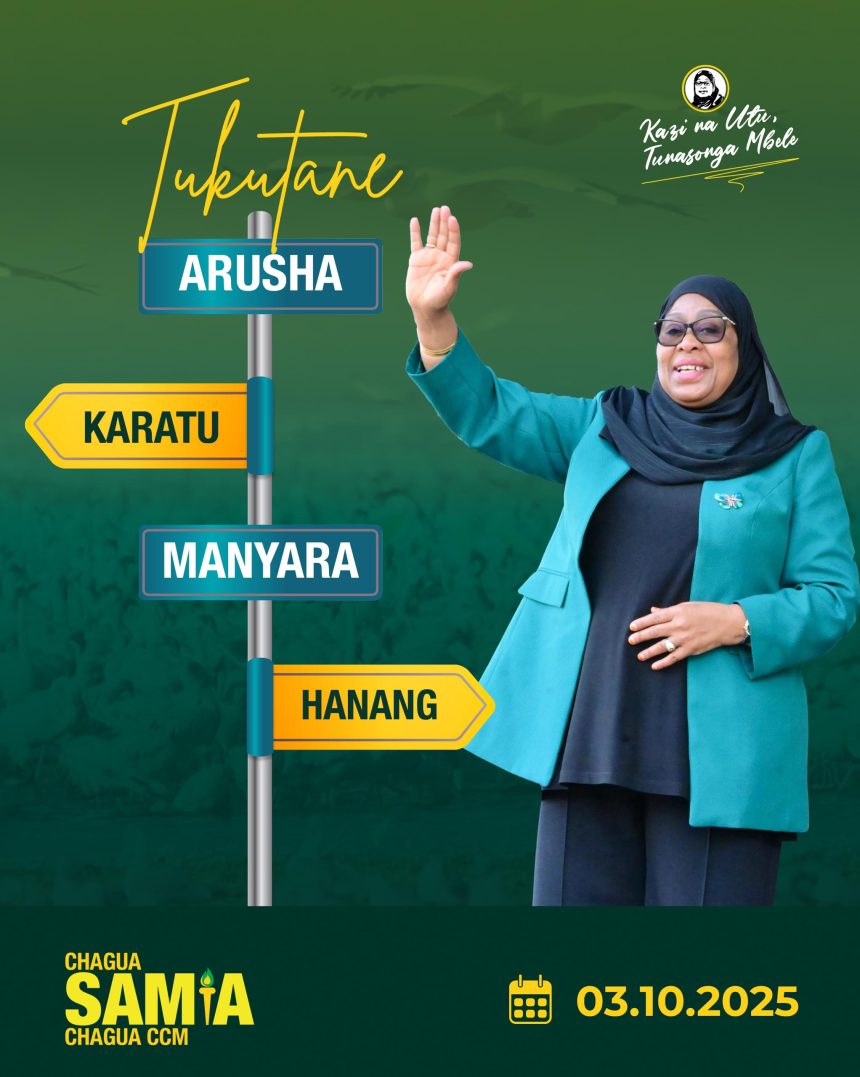 Mgombea Urais wa Jamhuri ya Muungano wa Tanzania kupitia Chama Cha Mapinduzi (CCM), Dkt. Samia Suluhu Hassan, anaendelea na mikutano ya kampeni leo katika mikoa ya Arusha na Manyara, ambapo atazunguka Karatu na Hanang’ akinadi Ilani ya Uchaguzi ya CCM ya mwaka 2025-2030.