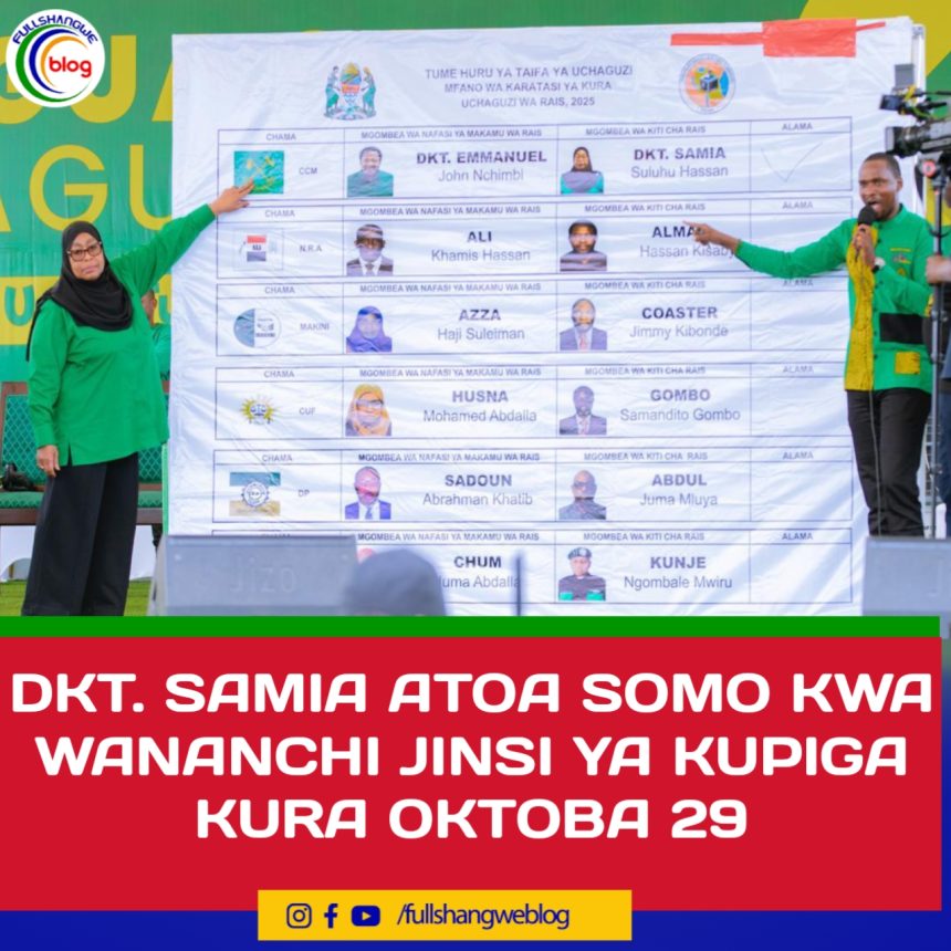 Mgombea wa nafasi ya Urais wa Jamhuri ya Muungano wa Tanzania kupitia Chama Cha Mapinduzi (CCM) na Mwenyekiti wa Chama hicho Taifa, Dkt. Samia Suluhu Hassan, ametoa somo kwa wananchi jinsi ya kupiga kura kwa usahihi kuelekea Uchaguzi Mkuu utakaofanyika Oktoba 29, 2025.