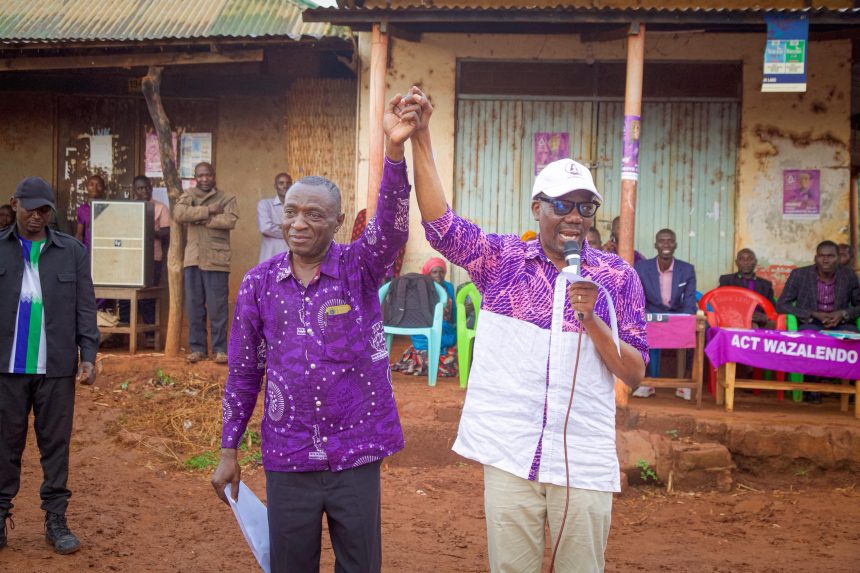 Kiongozi mstaafu wa ACT Wazalendo, Zitto Kabwe akimuombea kura mgombea wa jimbo la Kakonko wa chama hicho, Olaf Kaboboye wakati wa kampeni yake iliyofanyika katika kijiji cha Marenga kata ya Lugenge mkoani Kigoma,Oktoba 06, 2025.