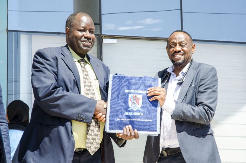 Mkurugenzi Mtendaji wa Taasisi ya Moyo Jakaya Kikwete (JKCI) Dkt. Peter Kisenge akimkabidhi zawadi Mkurugenzi wa Huduma za tiba kutoka Umoja wa Afrika (AU) Dkt. Adamu Isah alipotembelea Taasisi ya Moyo Jakaya Kikwete (JKCI) kufanya tathmini ya huduma za matibabu ya moyo zinavyotolewa na taasisi hiyo.