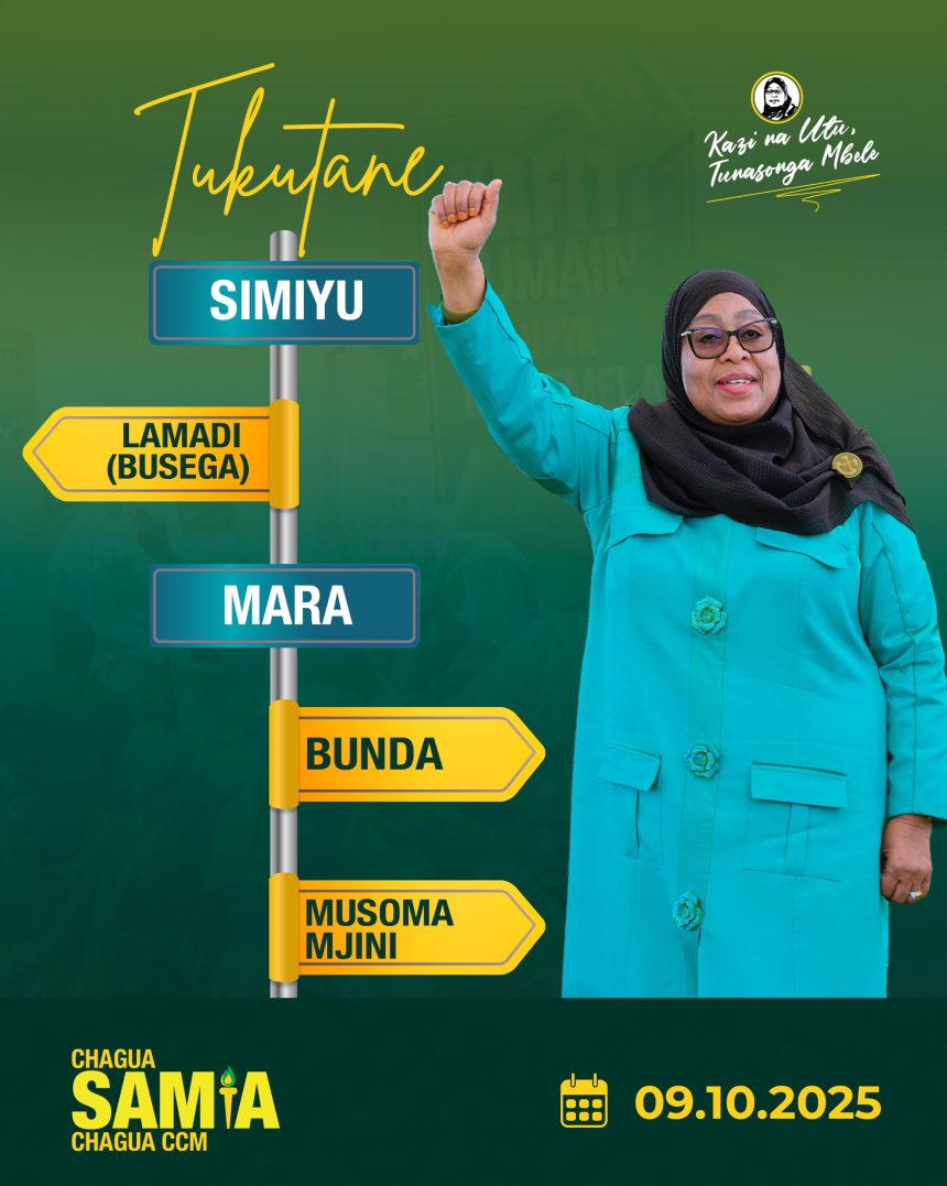 Mgombea wa Urais wa Jamhuri ya Muungano wa Tanzania kupitia Chama Cha Mapinduzi (CCM), Dkt. Samia Suluhu Hassan, leo Oktoba 09, 2025 anatarajiwa kuunguruma katika mikoa ya Simiyu na Mara, akiendelea na kampeni zake za urais baada ya kumaliza ziara yake katika Kanda ya Kaskazini.