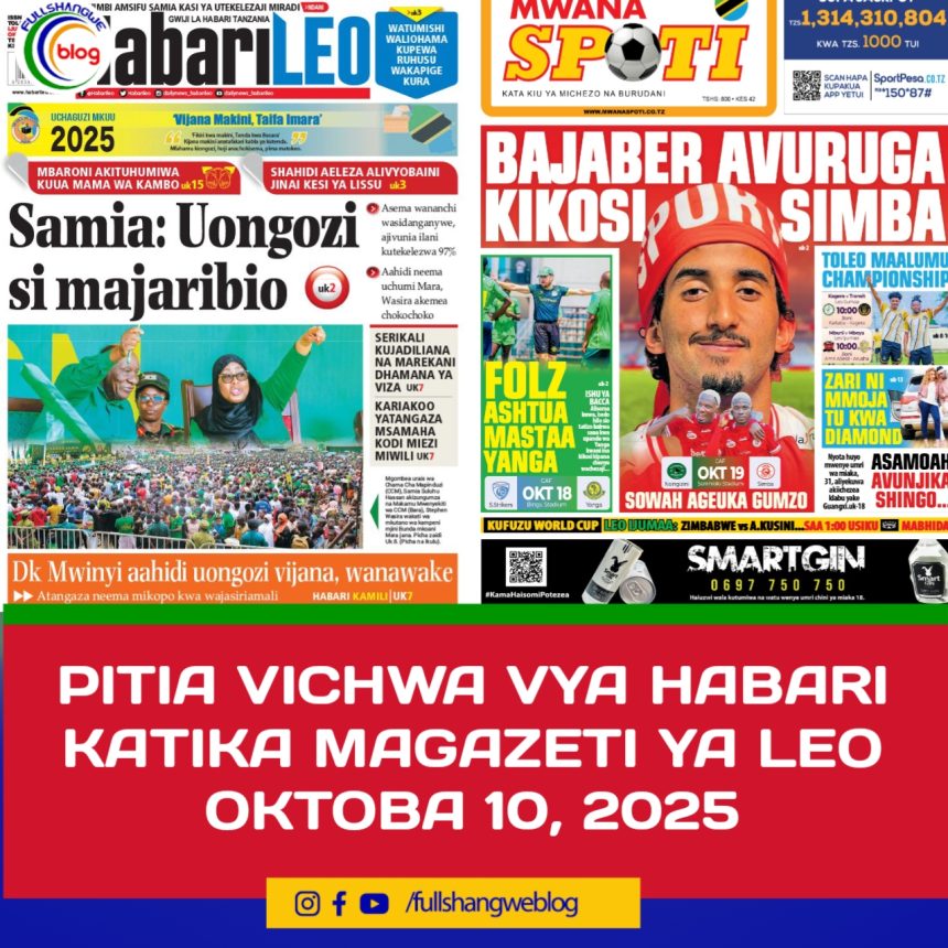 MagazetiPITIA VICHWA VYA HABARI KATIKA MAGAZETI YA LEO OKTOBA 10, 2025 Last updated: 2025/10/09 at 9:50 PM John Bukuku 1 month ago Share SHARE John Bukuku October 9, 2025 October 9, 2025 Share this Article Facebook Twitter Email Print Previous Article KATIBU MKUU MAGANGA ATEMBELEA BANDA LA OFISI YA WAZIRI MKUU KATIKA WIKI YA VIJANA MBEYA Next Article BALOZI YAKUB ATEMBELEA HOSPITALI YA BAMBAO KISIWA CHA ANJUAN COMORO