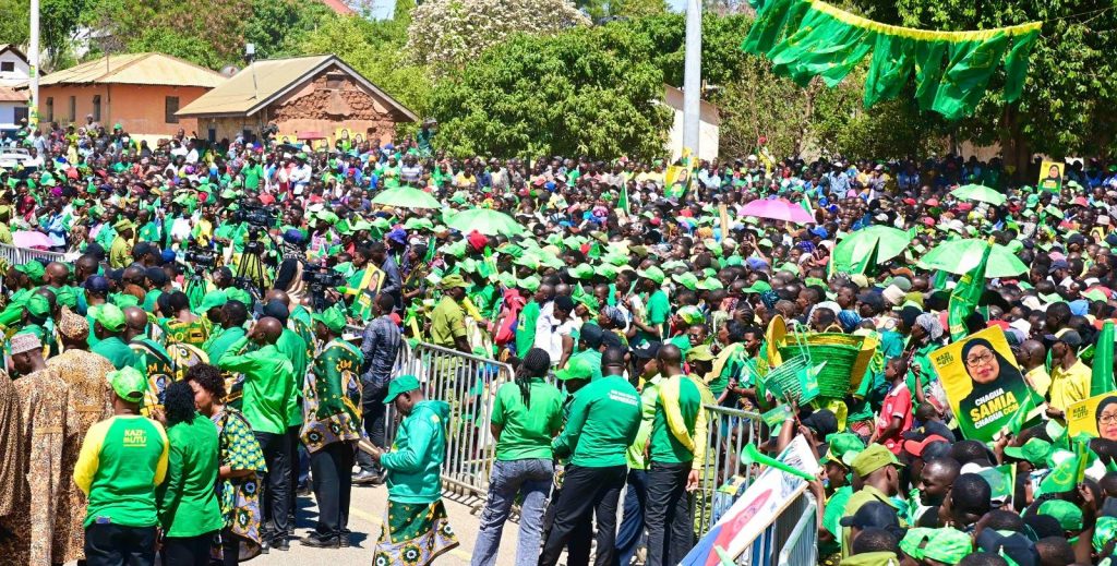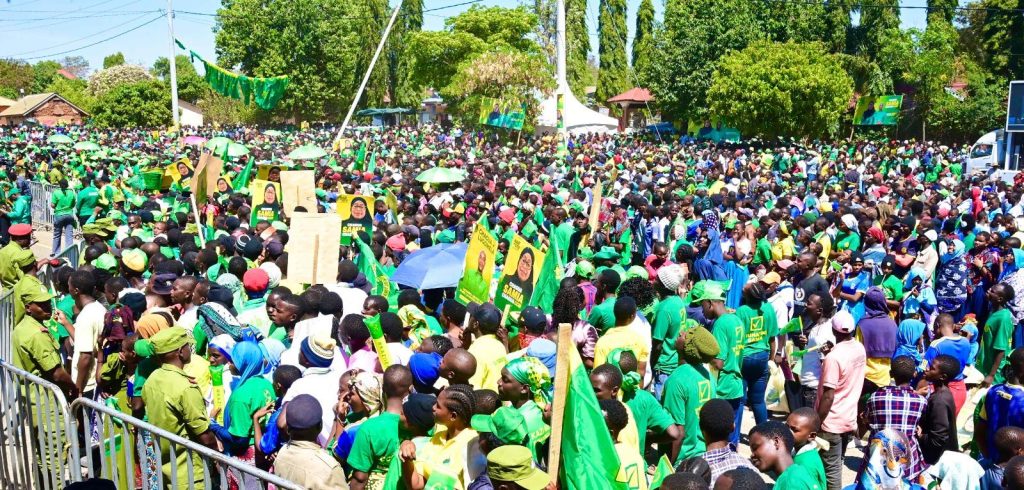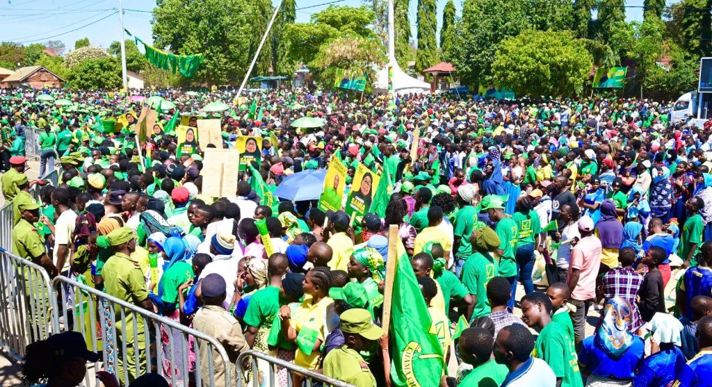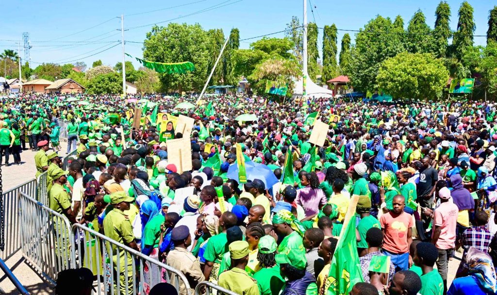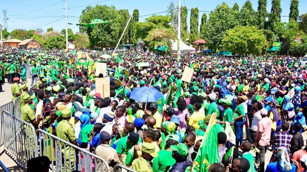 Sehemu ya Wananchi wa Maswa mkoani Simiyu waliohudhuria mkutano wa hadhara wa Kampeni wa Mgombea wa nafasi ya Rais wa Jamhuri ya Muungano wa Tanzania na Mwenyekiti wa Chama cha Mapinduzi (CCM) Taifa Ndugu Dkt. Samia Suluhu Hassan, tarehe 11 Oktoba, 2025