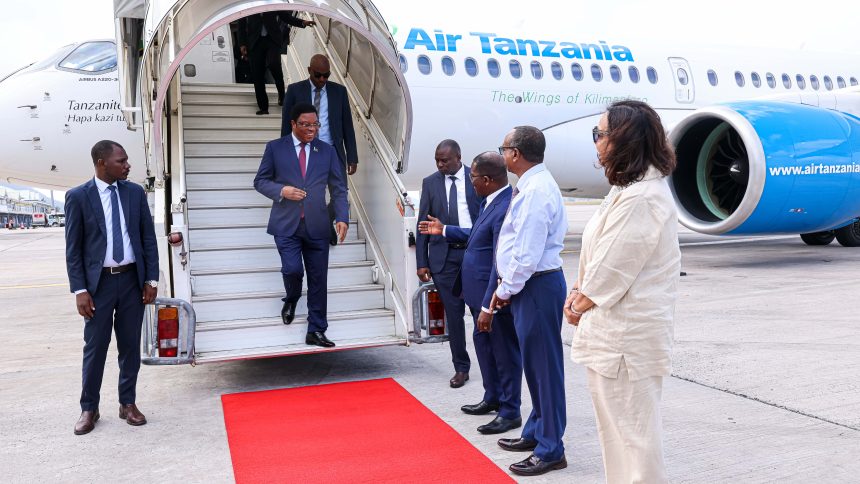 Waziri Mkuu Kassim Majaliwa akishuka kwenye ndege, wakati alipowasili katika Uwanja wa ndege wa Kimataifa wa Seychelles kwa ajili ya kumwakilisha Rais Dkt. Samia Suluhu Hassan kwenye uapisho wa Rais mteule wa nchi hiyo Dr. Patrick Herminie. Kutoka kulia ni Balozi wa Heshima Maryvonne Pool, Balozi wa a Seychelles Selby Pillay na Balozi wa Tanzania nchini Kenya anaeiwakilisha nchini Sychelles Dkt. Bernard Kibesse, Oktoba 26. 2025 (Picha na Ofisi ya Waziri Mkuu)