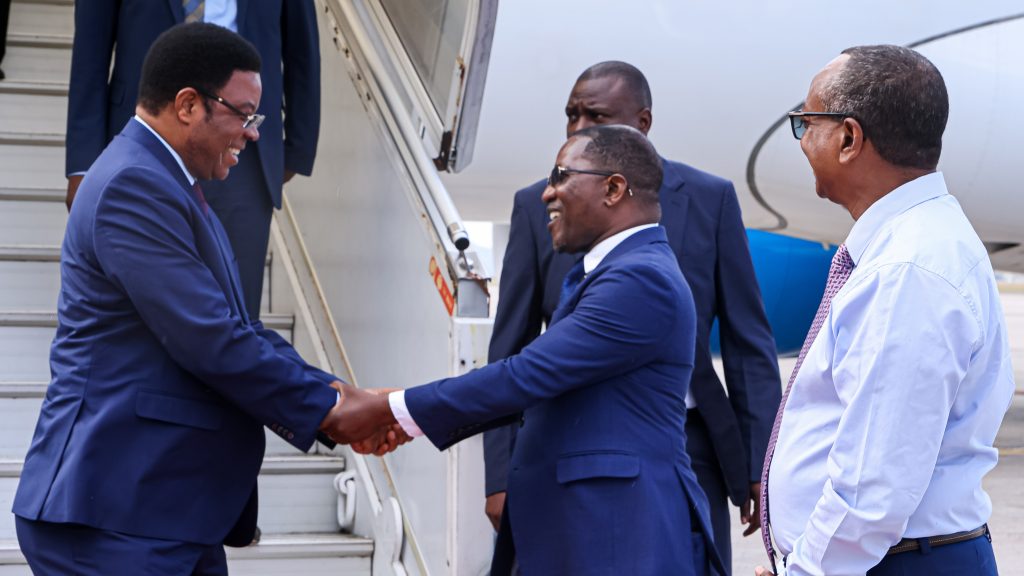 Waziri Mkuu Kassim Majaliwa akisalimiana na Balozi wa Tanzania Nchini Kenya anaeiwakilisha Tanzania nchini Sychelles Dkt. Bernard Kibesse, wakati alipowasili uwanja wa ndege wa kimataifa wa Sychelles kumuwakilisha Rais Dkt. Samia Suluhu Hassan kwenye uapisho wa Rais mteule wa nchi hiyo Dr. Patrick Herminie, Oktoba 26. 2025 (Picha na Ofisi ya Waziri Mkuu)