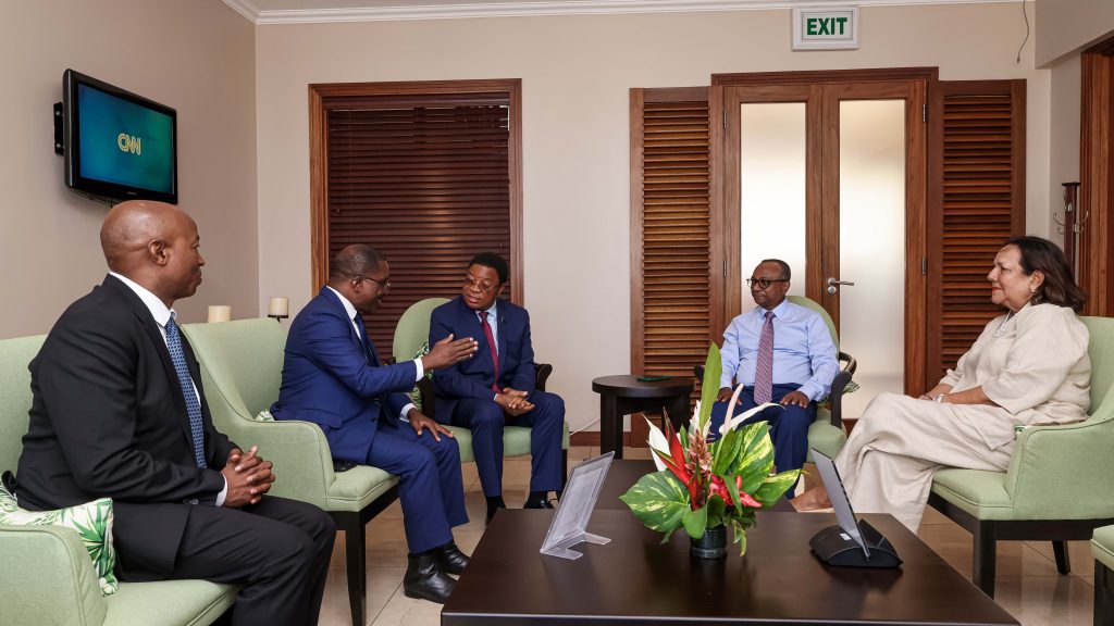 Waziri Mkuu Kassim Majaliwa akizungumza na Balozi wa Tanzania Nchini Kenya anaeiwakilisha Tanzania nchini Sychelles Dkt. Bernard Kibesse alipowasili uwanja wa ndege wa kimataifa wa Sychelles kumuwakilisha Rais Dkt. Samia Suluhu Hassan kwenye uapisho wa Rais mteule wa nchi hiyo Dr. Patrick Herminie. Kutoka kushoto ni Naibu Waziri wa Mambo ya Nje na Ushirikiano wa Kimataifa Cosato Chumi, Kulia Balozi wa Heshima Maryvonne Pool na Balozi wa Seychelles Selby Pillay, Oktoba 26. 2025 (Picha na Ofisi ya Waziri Mkuu)