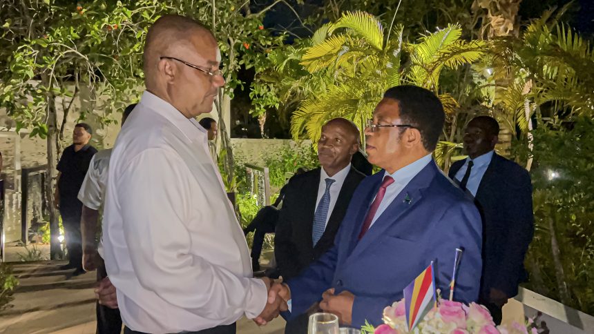 Waziri Mkuu Kassim Majaliwa akisalimiana na Rais wa Shelisheli, Dr. Patrick Herminie, baada ya kuapishwa kua Rais wa awamu ya sita wa nchi hiyo, katika tafrija ya uapisho iliyofanyika katika hoteli ya Story Seychelles, jijini Victoria Sychelles, Oktoba 26. 2025 (Picha na Ofisi ya Waziri Mkuu)
