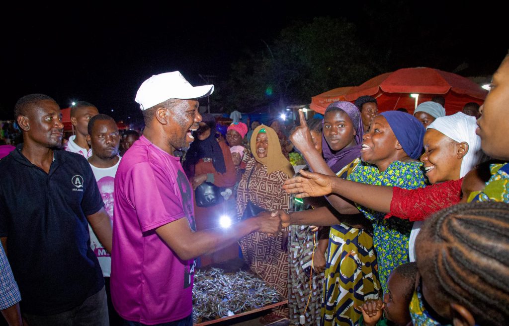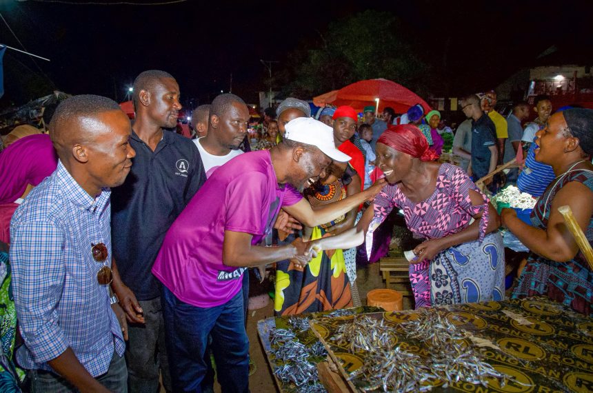Mgombea ubunge jimbo la kigoma mjini kupitia ACT Wazalendo, Zitto Kabwe akifurahi pamoja na wauzaji wa bidhaa mbalimbali katika soko la jioni la Marungu, alipopita sokoni hapo kuwasalimia baada ya mkutano wake wa kampeni uliofanyika katika kata ya Mwanga kusini, jimboni hapo, Oktoba 26, 2025