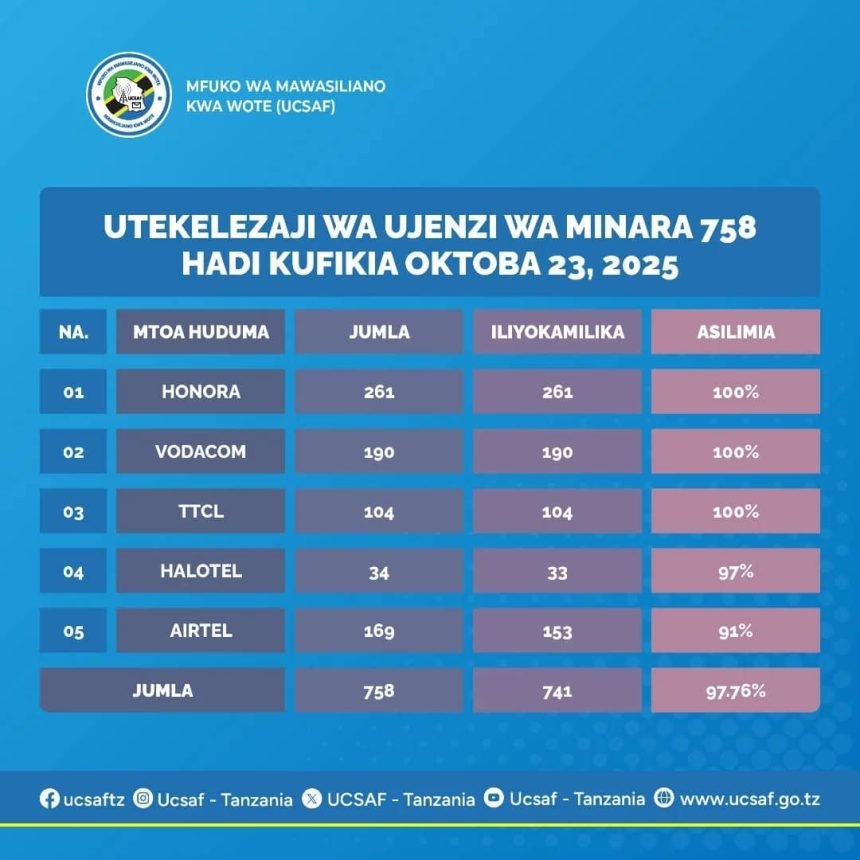 Hadi kufikia tarehe 23 Oktoba, 2025 Serikali ya Awamu ya Sita, kupitia Mfuko wa Mawasiliano kwa Wote (UCSAF), ilikuwa imekamilisha ujenzi wa minara 741 kati ya minara 758 iliyopangwa kujengwa katika kata 713 nchini. Mradi ambao unalenga kunufaisha vijiji 1,407 ambavyo awali havikuwa na huduma za mawasiliano, ambapo hadi sasa takribani vijiji 1,300 tayari vimefikishiwa huduma.