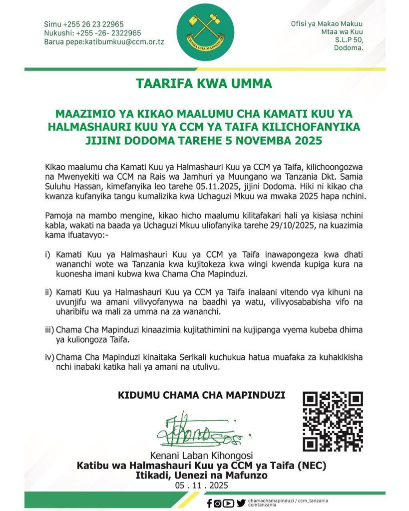 Mwenyekiti wa Chama cha Mapinduzi (CCM) na Rais wa Jamhuri ya Muungano wa Tanzania Ndugu. Dkt. Samia Suluhu Hassan akiongoza Kikao Maalumu cha Kamati Kuu ya Halmashauri Kuu ya CCM Taifa iliyoketi jijini Dodoma, leo Jumatano, Novemba 5, 2025.