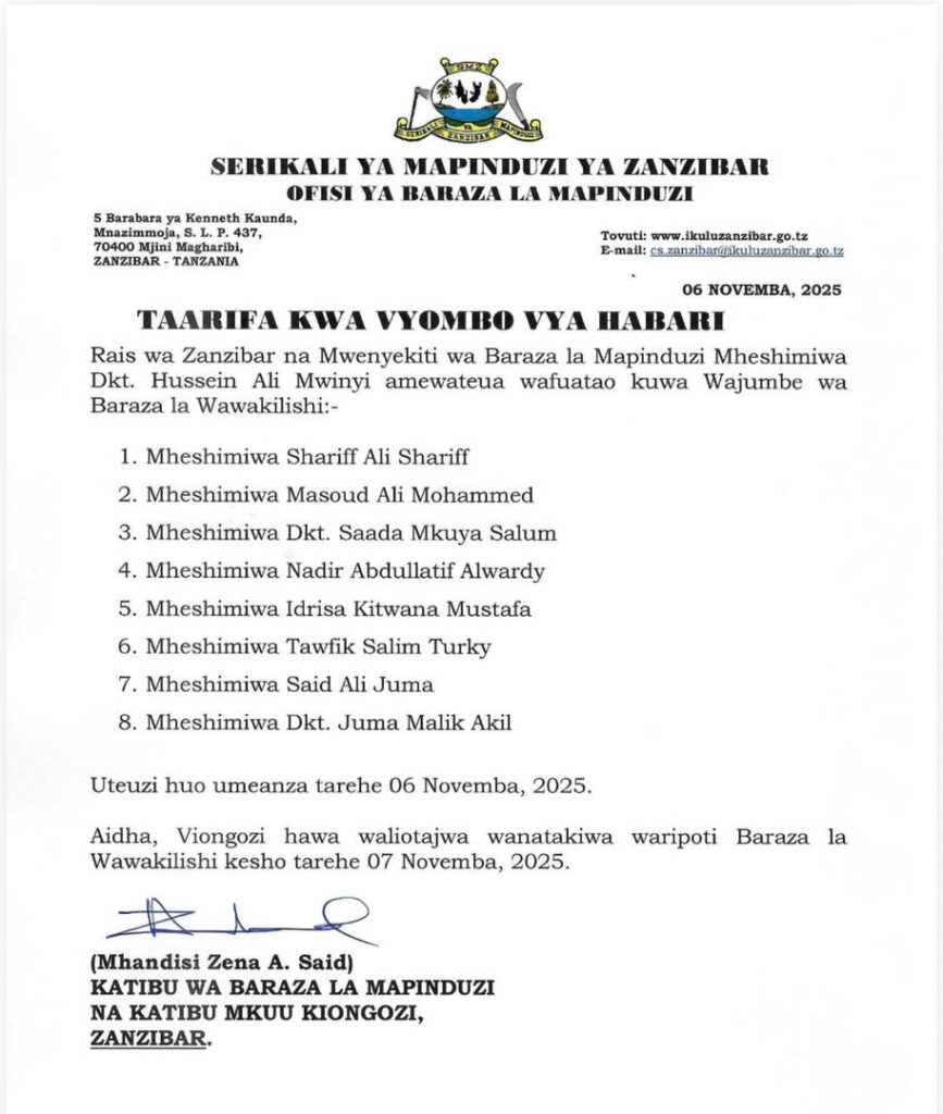 SiasaRAIS DKT. MWINYI ATEUA 8 KUWA WAJUMBE WA BARAZA LA WAWAKILISHI Last updated: 2025/11/06 at 5:45 PM John Bukuku 3 hours ago Share SHARE John Bukuku November 6, 2025 November 6, 2025 Share this Article Facebook Twitter Email Print Previous Article RAIS MWINYI AMUAPISHA MWANASHERIA MKUU WA SMZ Next Article RC MAKALLA ATOA WITO WA KULINDA AMANI MPAKA WA NAMANGA