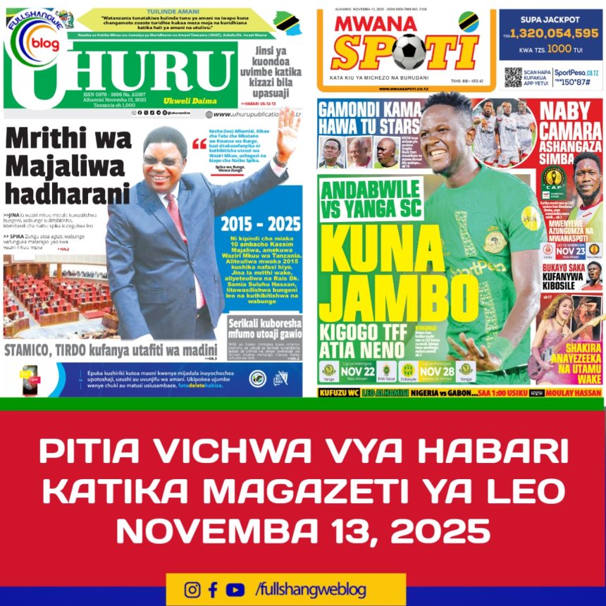 MagazetiPITIA VICHWA VYA HABARI KATIKA MAGAZETI YA LEO NOVEMBA 13, 2025 Last updated: 2025/11/12 at 11:12 PM John Bukuku 23 hours ago Share SHARE John Bukuku November 12, 2025 November 12, 2025 Share this Article Facebook Twitter Email Print Previous Article JWTZ HAIHUSIKI HIZI NI TAARIFA ZA UZUSHI MTUPU Next Article DKT. MWIGULU NCHEMBA ATEULIWA KUWA WAZIRI MKUU WA TANZANIA