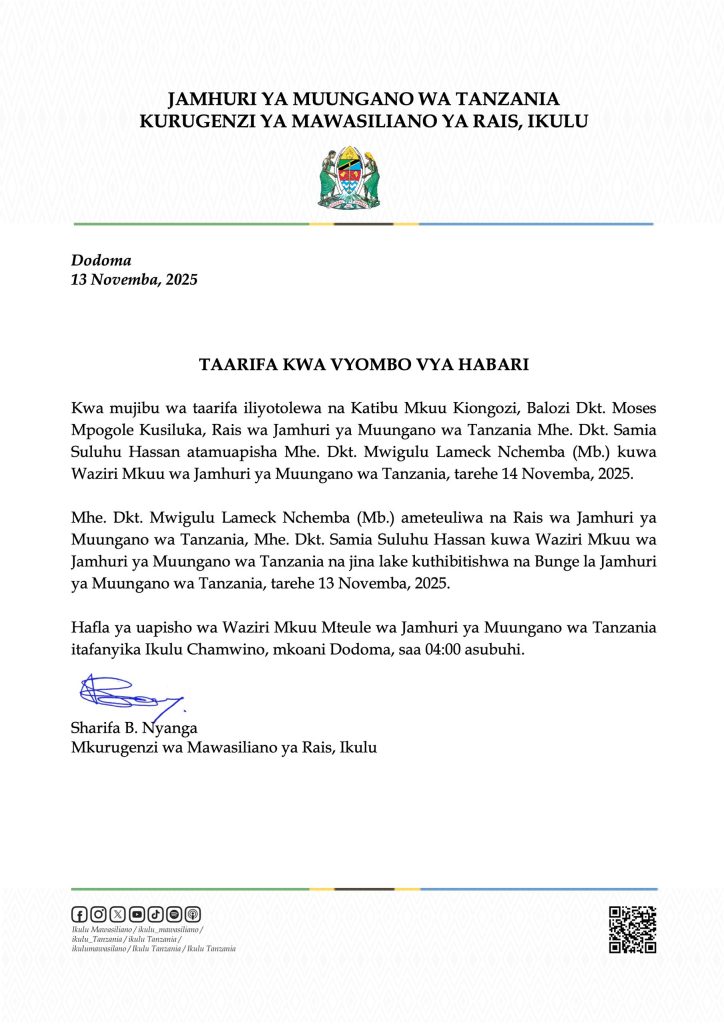 SiasaDKT. MWIGULU NCHEMBA KUAPISHWA NOVEMBA 14, 2025 IKULU CHAMWINO Last updated: 2025/11/13 at 10:20 AM John Bukuku 12 hours ago Share SHARE John Bukuku November 13, 2025 November 13, 2025 Share this Article Facebook Twitter Email Print Previous Article DKT. MWIGULU NCHEMBA ATEULIWA KUWA WAZIRI MKUU WA TANZANIA Next Article DKT. MWIGULU NCHEMBA AAHIDI SERIKALI YA KUSIKILIZA WANANCHI