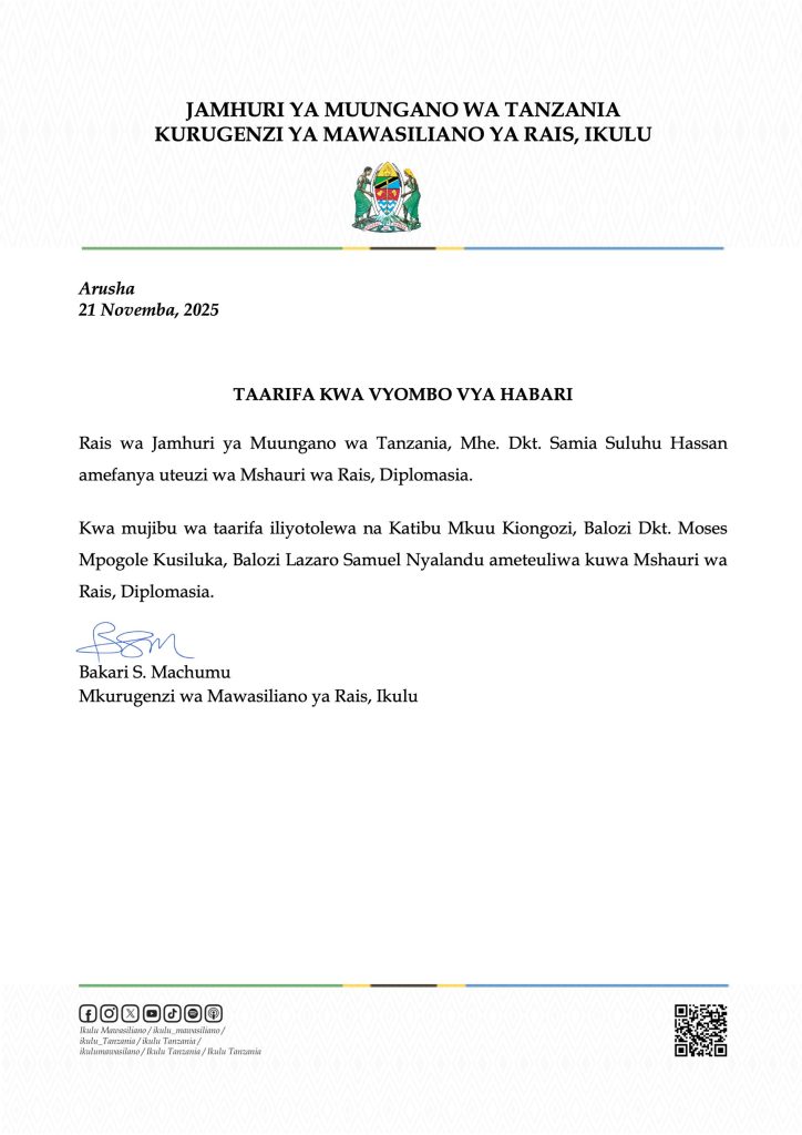 SiasaNYALANDU ATEULIWA KUWA MSHAURI WA RAIS MASUALA YA DIPLOMASIA Last updated: 2025/11/21 at 7:20 PM John Bukuku 3 hours ago Share SHARE John Bukuku November 21, 2025 November 21, 2025 Share this Article Facebook Twitter Email Print Previous Article WAGANGA WAKUU WA WILAYA WAPATIWA MAFUNZO YA UONGOZI Next Article IAA KUTAWANYA MACHIAPISHO YA TAFITI ZA WANAFUNZI – WAHITIMU 2,500 KUTOKA MATAWI SITA WAPIGA HATUA MPYA