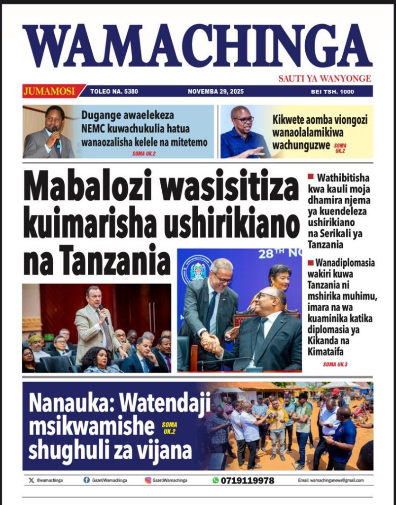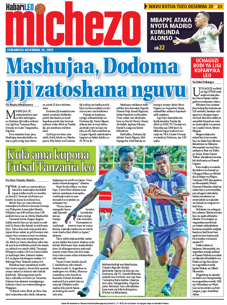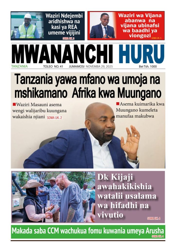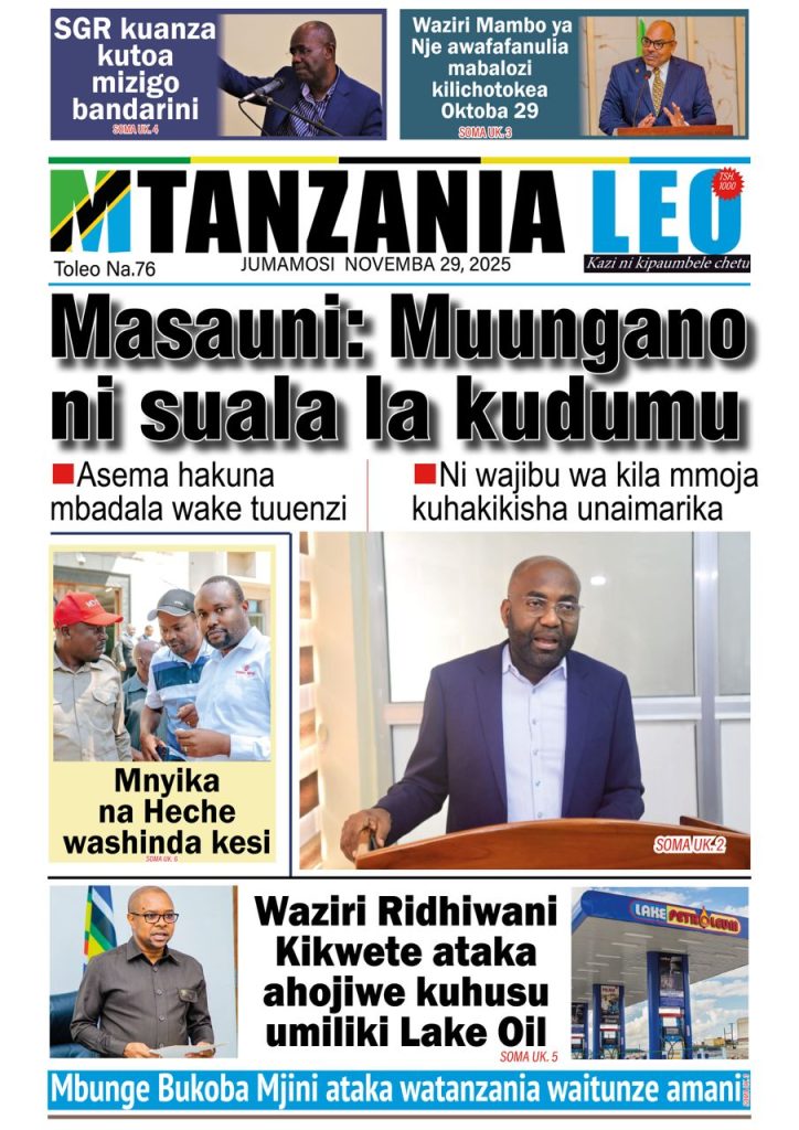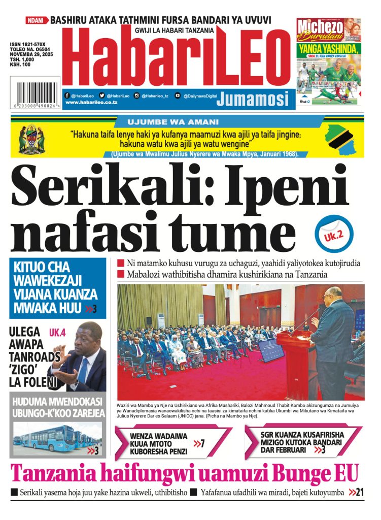 MagazetiPITIA VICHWA VYA HABARI KATIKA MAGAZETI YA LEO NOVEMBA 29, 2025 Last updated: 2025/11/28 at 10:49 PM John Bukuku 22 minutes ago Share SHARE John Bukuku November 28, 2025 November 28, 2025 Share this Article Facebook Twitter Email Print Previous Article YANGA YAENDELEA KUJIWEKA VIZURI KUNDI B MICHUANO YA CAF Next Article SERIKALI YATANGAZA MIKAKATI 8 KUVUTIA UWEKEZAJI, KUONGEZA AJIRA KWA VIJANA