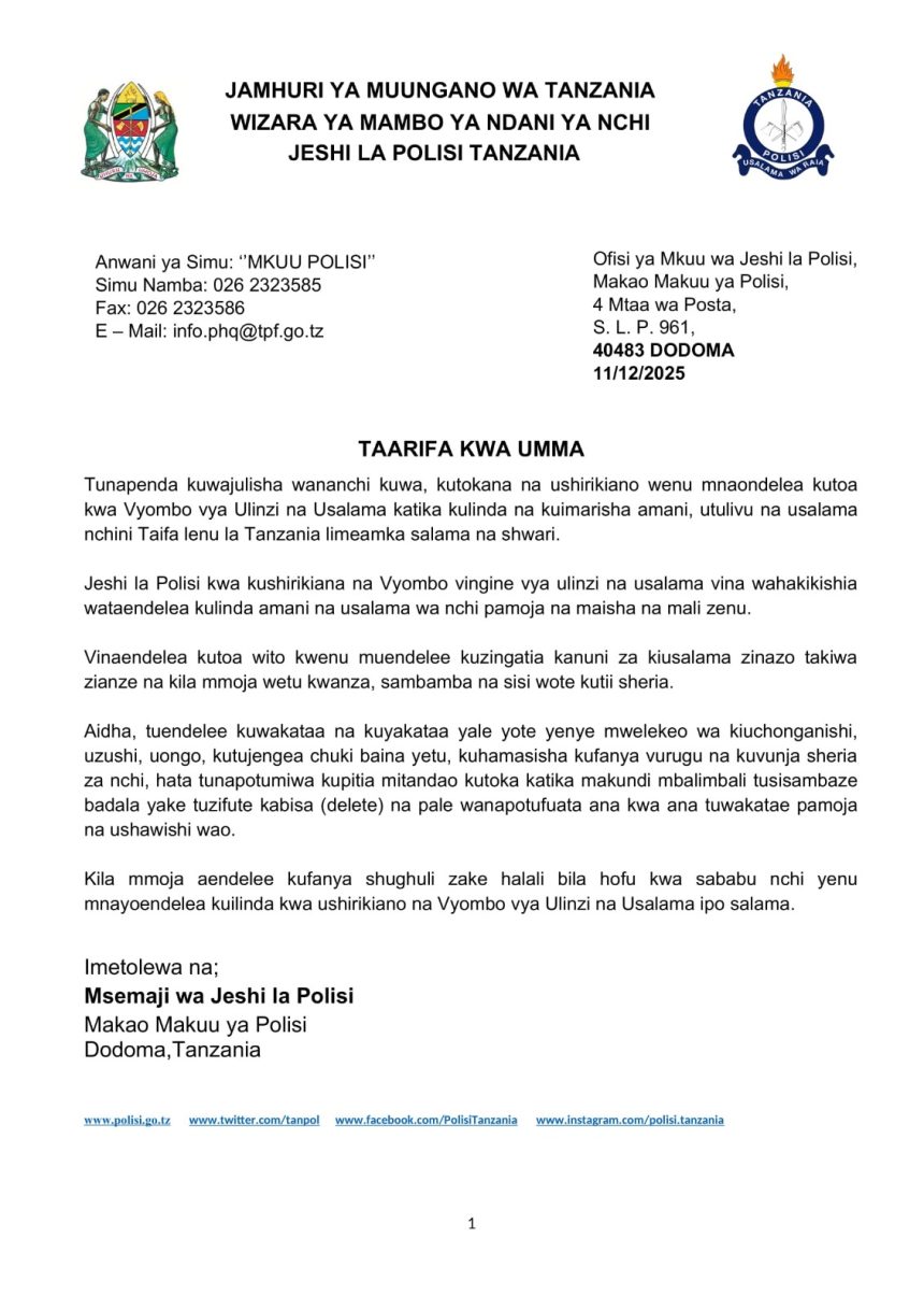 MchanganyikoPOLISI HALI YA USALAMA 11.12.2025 Last updated: 2025/12/11 at 6:05 AM John Bukuku 5 months ago Share SHARE John Bukuku December 11, 2025 December 11, 2025 Share this Article Facebook Twitter Email Print Previous Article BALOZI WA TANZANIA NCHINI ZIMBABWE AKUTANA NA BALOZI WA CHINA Next Article ADHABU YA KUCHEPUKA NA KIMADA KATIKA KABILA LA WAHADZABE