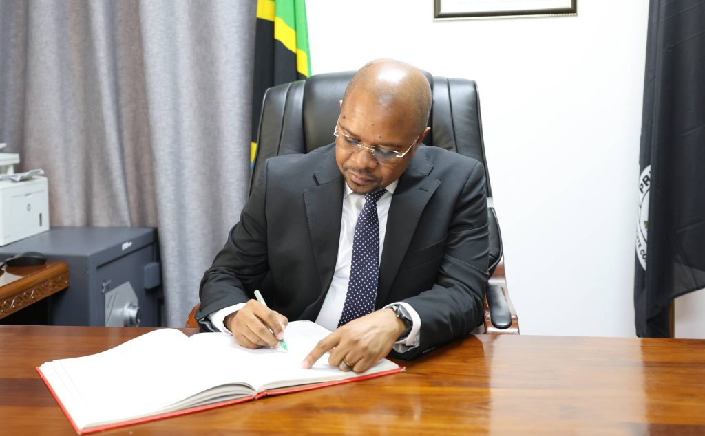 Waziri wa Nchi, Ofisi ya Rais, Menejimenti ya Utumishi wa Umma na Utawala Bora, Mhe. Ridhiwani Kikwete akisaini kitabu cha wageni mara baada ya kuwasili katika ofisi za Taasisi ya Kuzuia na Kupambana na Rushwa (TAKUKURU) wakati wa ziara yake ya kikazi iliyofanyika jijini Dodoma.