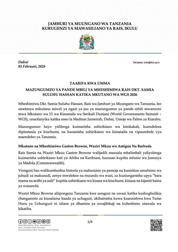 Rais wa Jamhuri ya Muungano wa Tanzania, Mhe. Dkt. Samia Suluhu Hassan akiondoka eneo la mkutano wa Jukwaa la Serikali za Dunia (WGS2026), tarehe 3 Februari, 2026, Madinat Jumeirah, Dubai, Umoja wa Falme za Kiarabu (UAE).