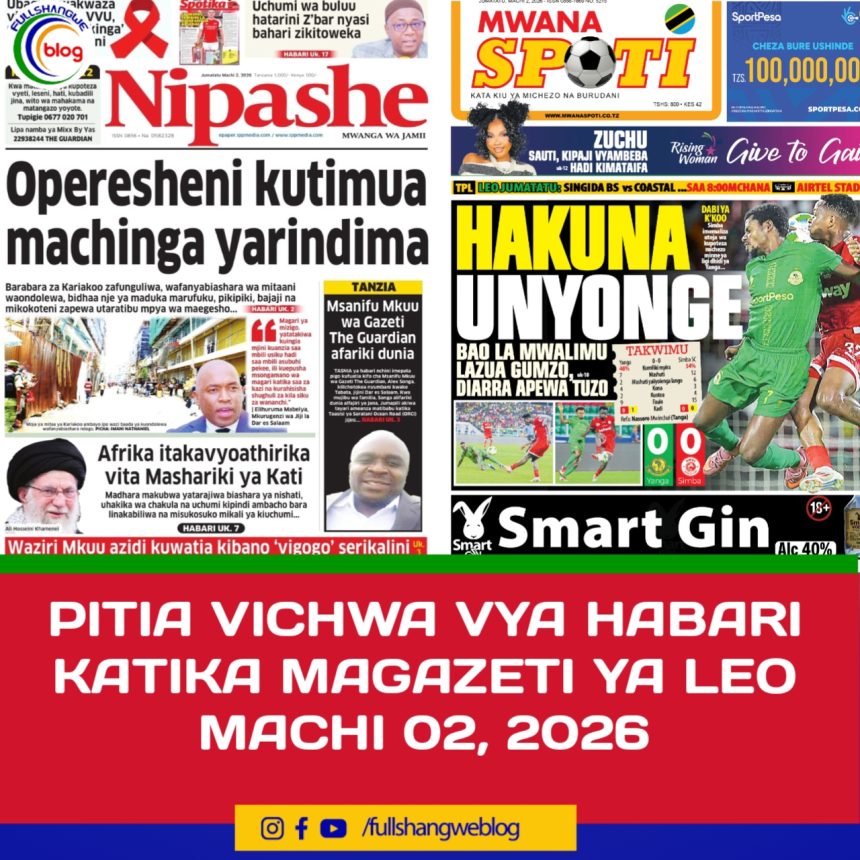 MagazetiPITIA VICHWA VYA HABARI KATIKA MAGAZETI YA LEO MACHI 02, 2026 Last updated: 2026/03/02 at 12:48 AM John Bukuku 2 months ago Share SHARE John Bukuku March 2, 2026 March 1, 2026 Share this Article Facebook Twitter Email Print Previous Article MILIONI 30 ZATOA TUMAINI KWA WATOTO WENYE MAGONJWA YA MOYO Next Article CCTV YAFICHUA JAMAA AKIIBA SIMU 17 NDANI YA MATATU MOJA KWA DAKIKA 12 TU