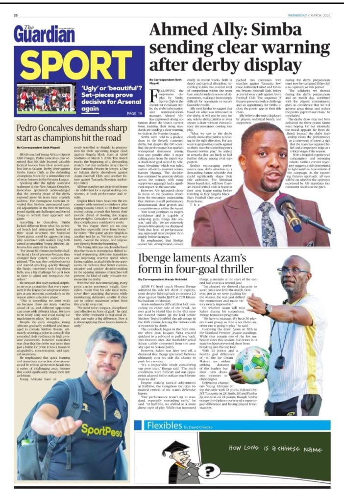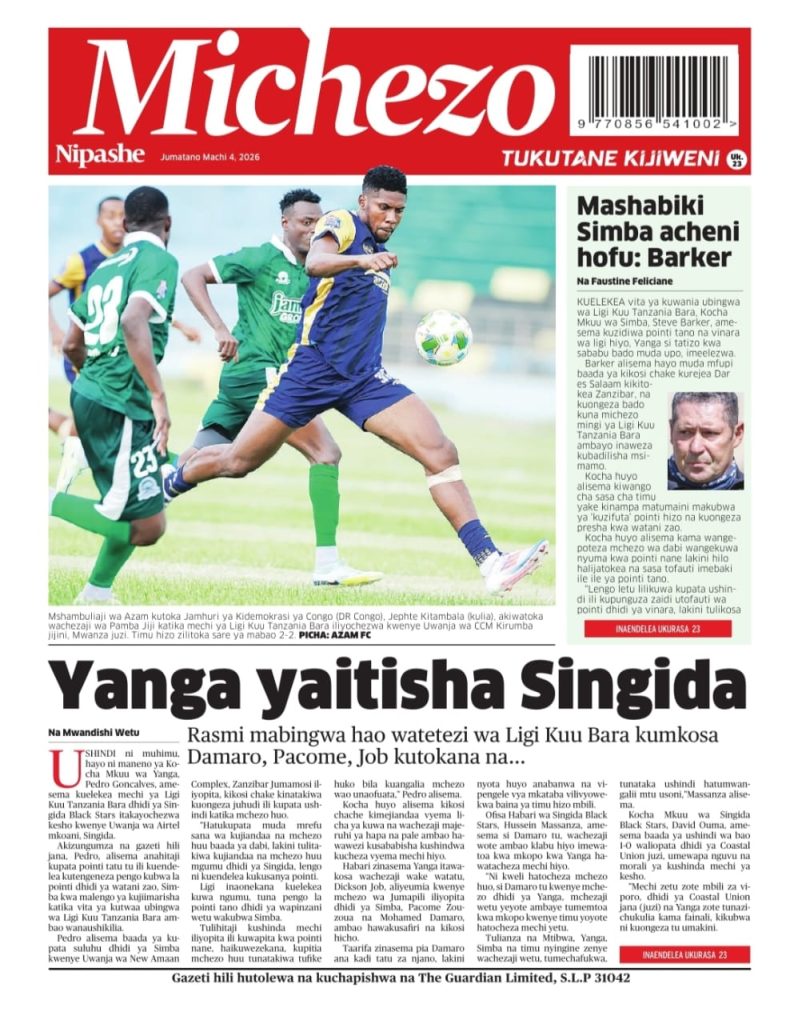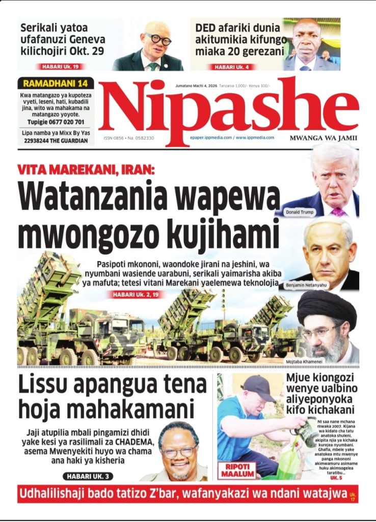 MagazetiPITIA VICHWA VYA HABARI KATIKA MAGAZETI YA LEO MACHI 04, 2026 Last updated: 2026/03/04 at 4:00 AM John Bukuku 2 weeks ago Share SHARE John Bukuku March 4, 2026 March 3, 2026 Share this Article Facebook Twitter Email Print Previous Article MADINI YA TSAVORITE: FAHARI YA TANZANIA ISIYOJULIKANA NA WEMGI Next Article TARURA MBINGA KUTUMIA SHILINGI BILIONI 2.5 KUBORESHA MIUNDOMBINU YA BARABARA