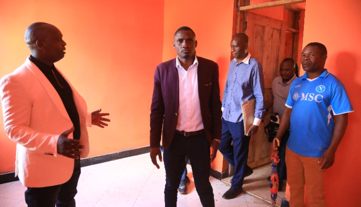 Afisa Ushirika kutoka Halmashauri ya Wilaya Mbinga Mkoani Ruvuma Leo Kumburu wa pili kushoto,akimsikiliza Mwenyekiti wa Chama cha msingi cha Ushirika Liyombo Joseph Mbele wa kwanza kushoto,ya kukagua nyumba ya kisasa iliyojengwa na Chama hicho kwa ajili ya kuishi familia tatu za walimu wa shule ya msingi Liyombo.