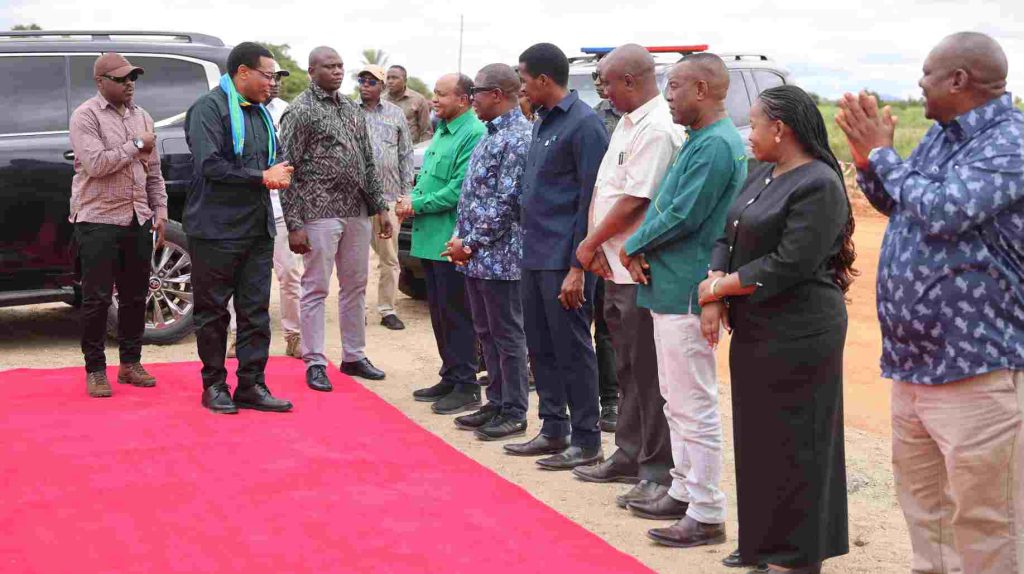 Waziri Mkuu, Dkt. Mwigulu Nchemba akisalimiana na viongozi alipowasili kwenye kijiji cha Makang’wa katika jimbo la Mvumi kukagua ujenzi wa barabara ya kiwango cha lami ya Ntyuka – Mvumi – Kikombo Mkoani Dodoma, Aprili 12, 2026. (Picha na Ofisi ya Waziri Mkuu)