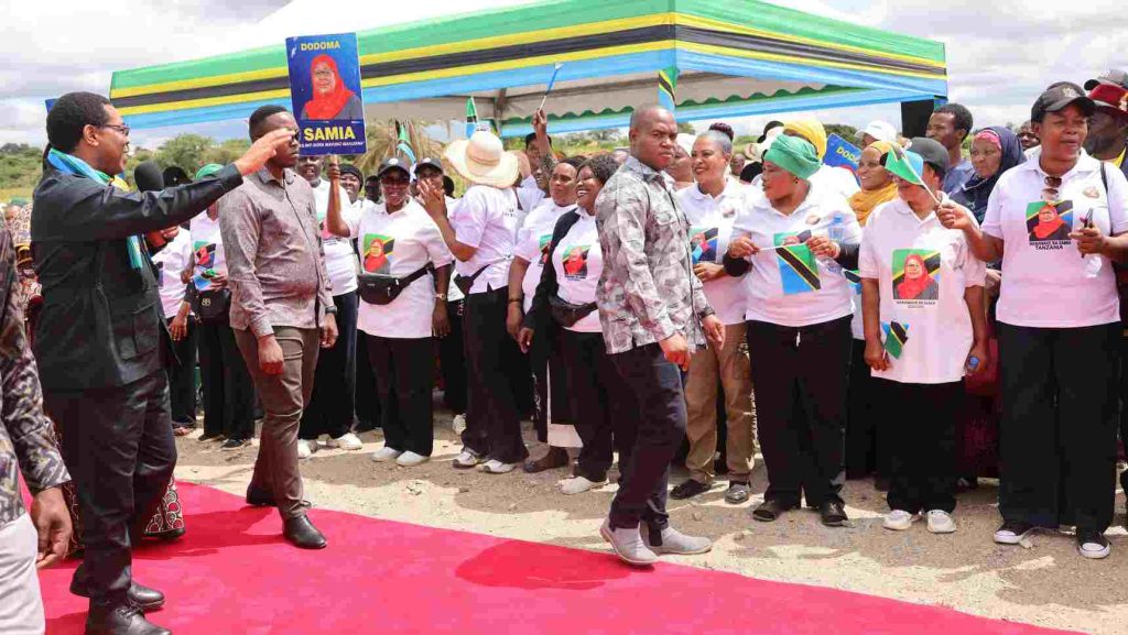 Waziri Mkuu, Dkt. Mwigulu Nchemba akiwapungia wananchi alipowasili kwenye kijiji cha Makang’wa katika jimbo la Mvumi kukagua ujenzi wa barabara ya kiwango cha lami ya Ntyuka – Mvumi – Kikombo Mkoani Dodoma, Aprili 12, 2026. (Picha na Ofisi ya Waziri Mkuu)
