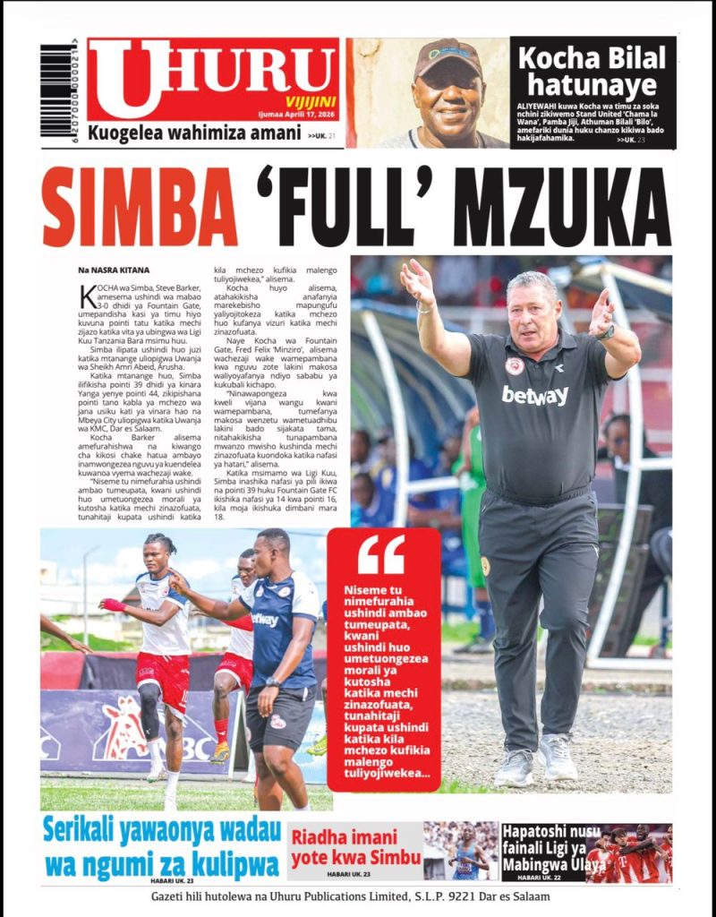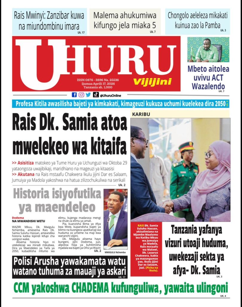 MagazetiPITIA VICHWA VYA HABARI KATIKA MAGAZETI YA LEO APRIL 17, 2026 Last updated: 2026/04/16 at 8:26 PM John Bukuku 3 hours ago Share SHARE John Bukuku April 16, 2026 April 16, 2026 Share this Article Facebook Twitter Email Print Previous Article SERIKALI YAENDELEA NA MKAKATI WA KULINDA VYANZO VYA MAJI NCHINI Next Article KAMATI YA UTALII, BIASHARA NA KILIMO BARAZA LA WAWAKILISHI YADHAMIRIA MAMLAKA YA VIPIMO ZANZIBAR IFIKIE VIWANGO VYA WMA BARA